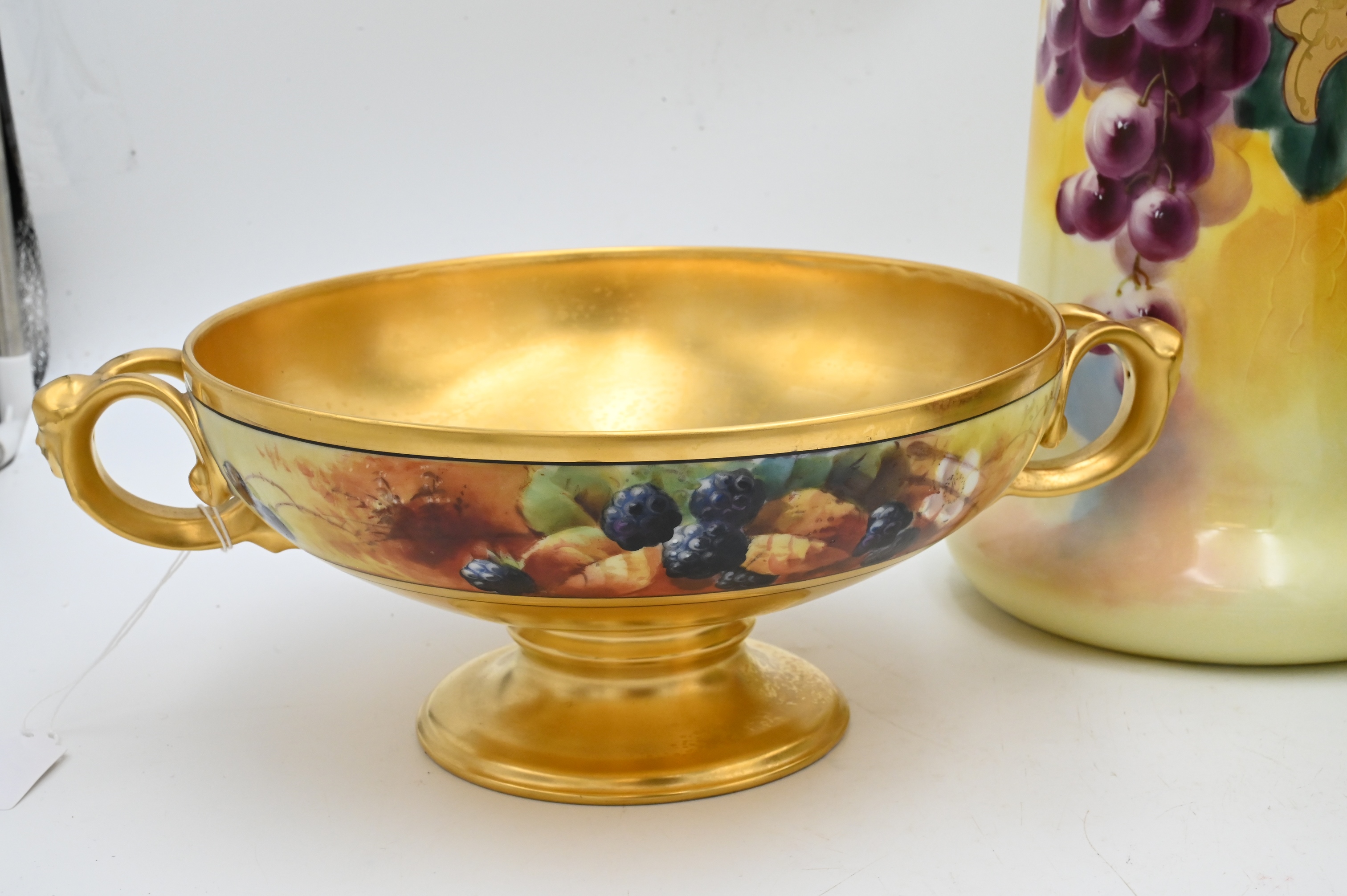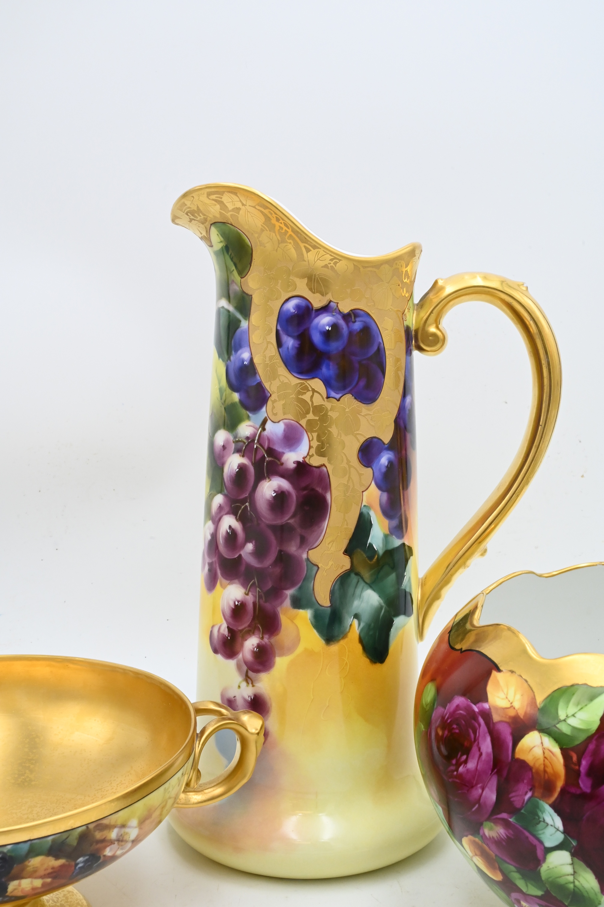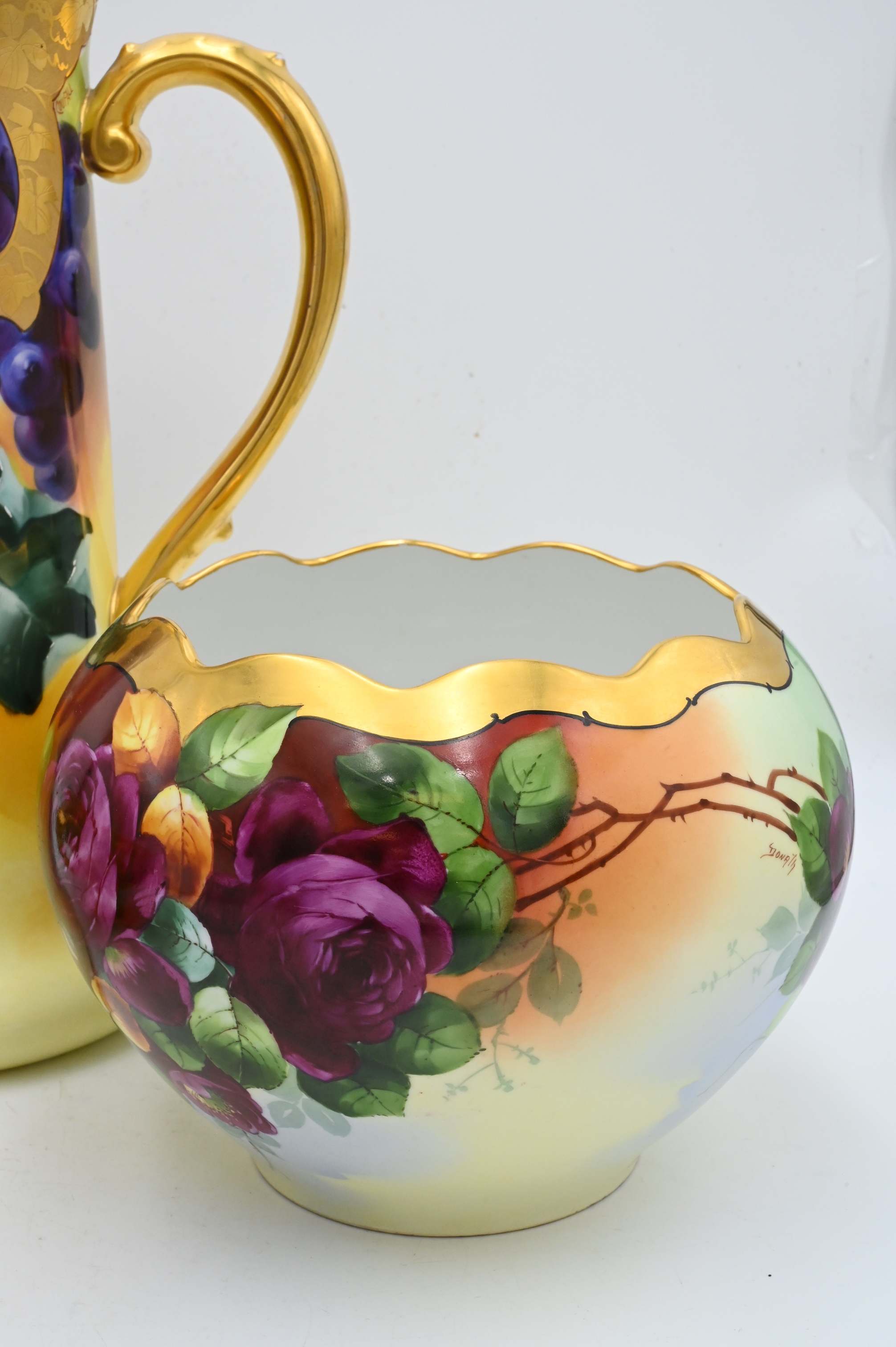 Three Hand Painted Porcelain Group, to include large Limoges Ewer Pitcher having hand painted fruit signed Rosenthal, Bavaria handled fruit bowl and Donath flower bowl, height of pitcher 16 inches, diameter of Donath bowl 8 inches.
