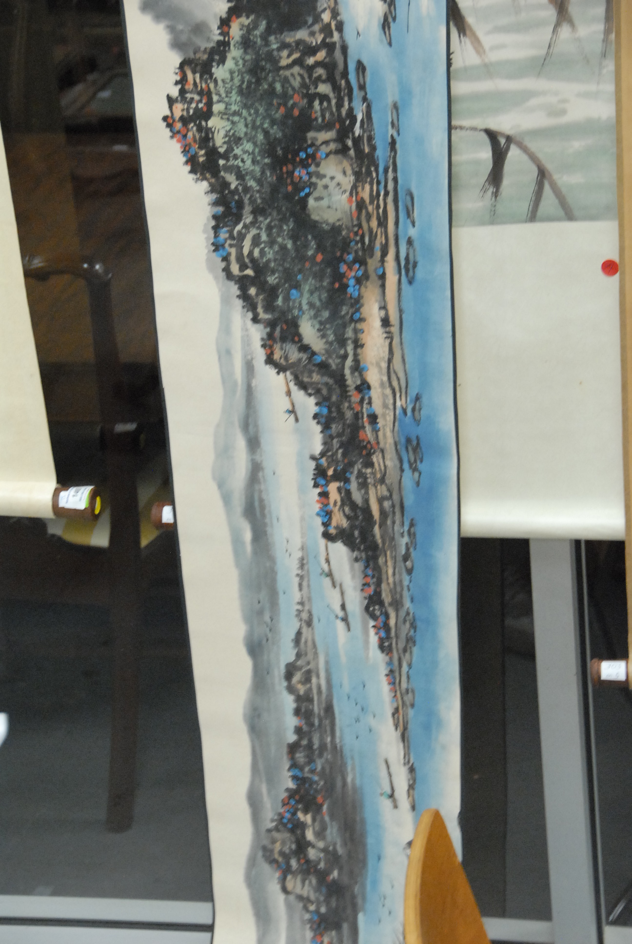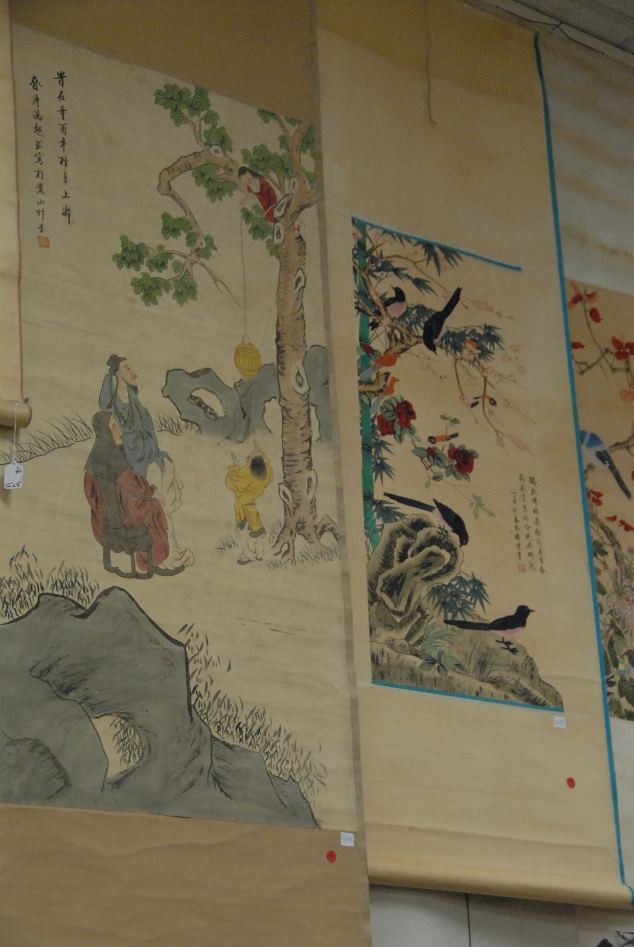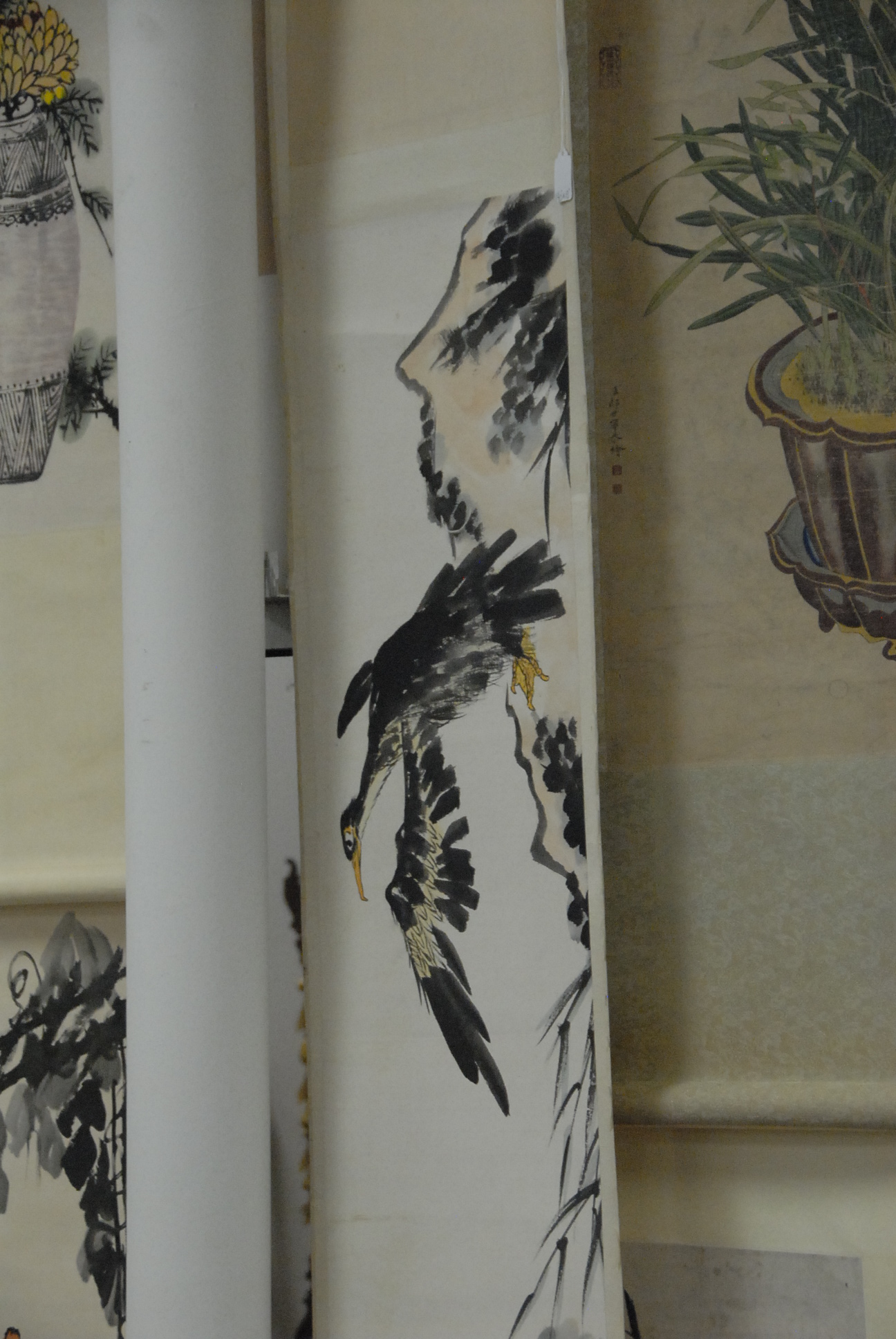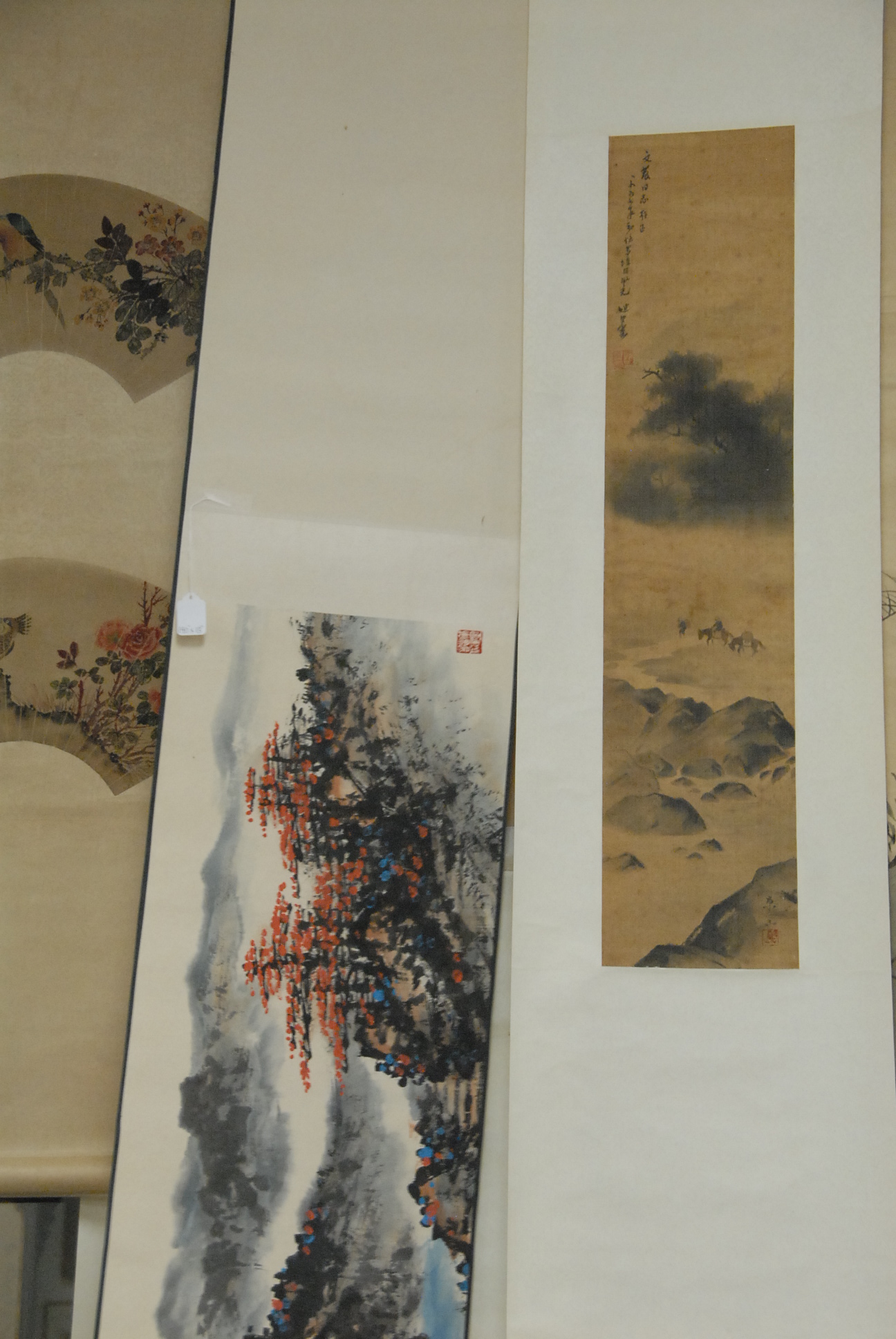 Three scrolls, one vertical watercolor on silk landscape and two horizontal scrolls one landscape and one with flying birds.