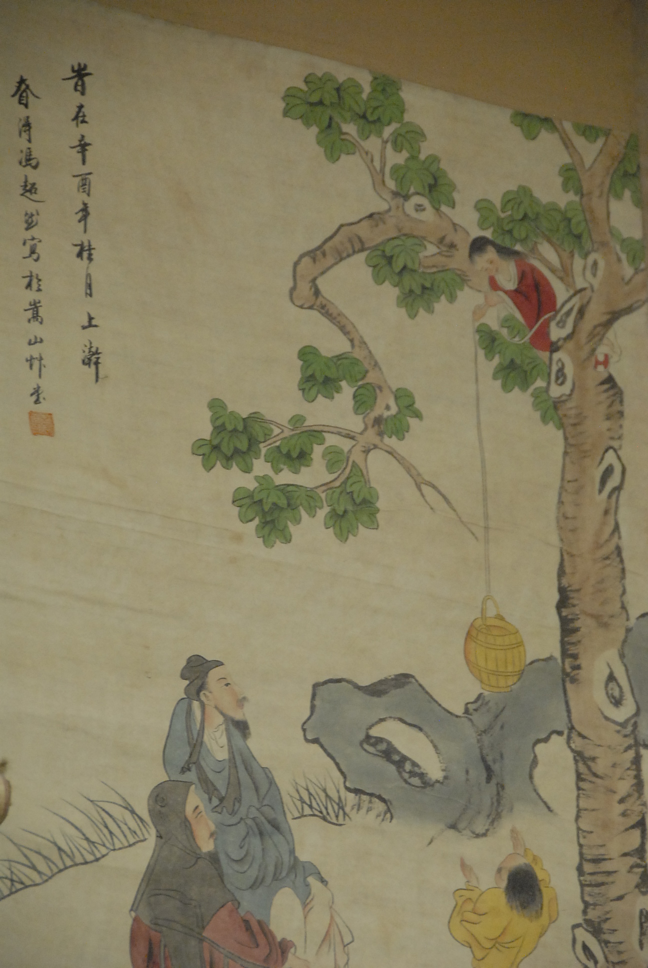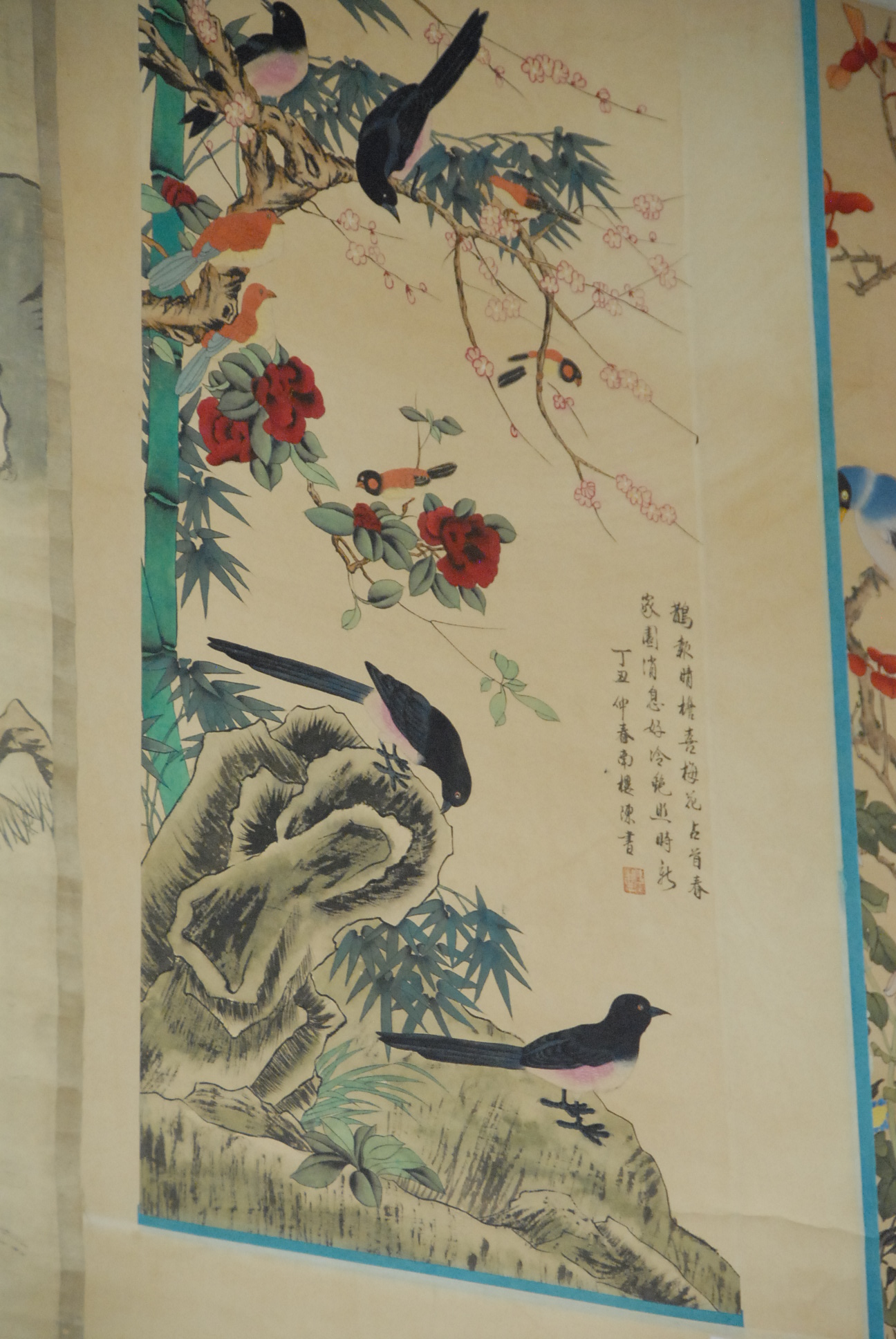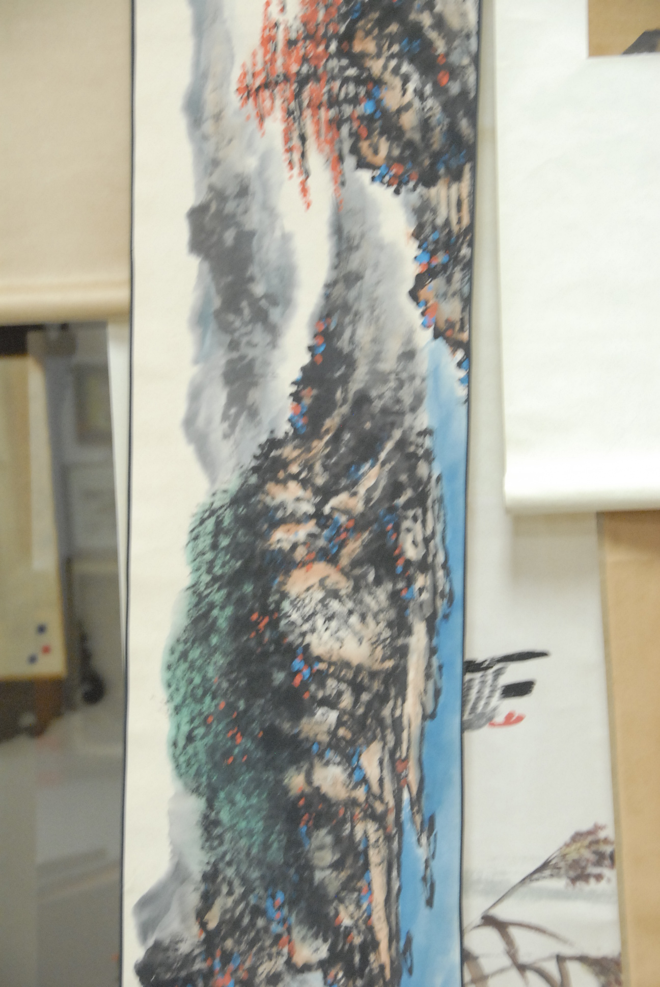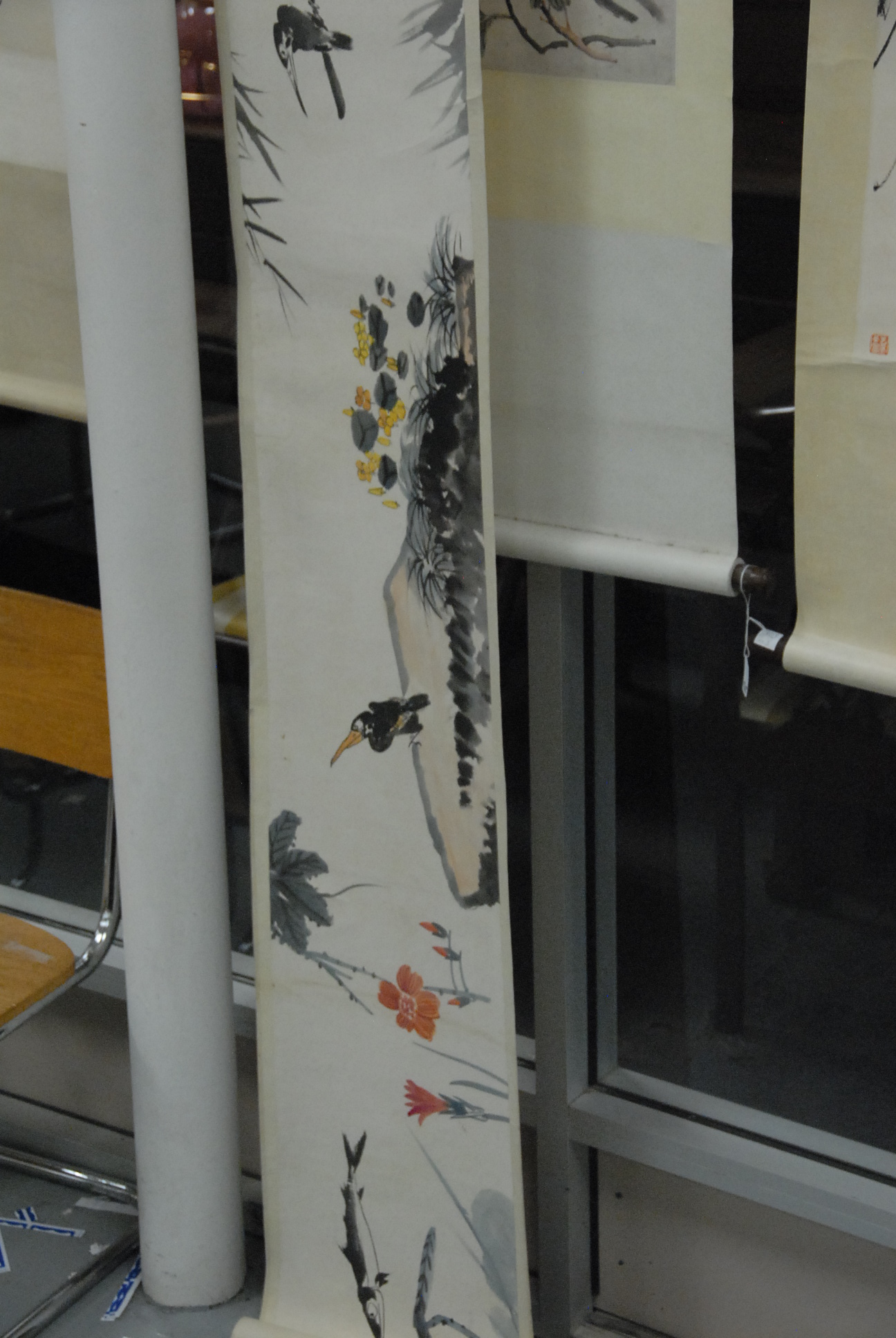 Three scrolls, one vertical watercolor on silk landscape and two horizontal scrolls one landscape and one with flying birds.