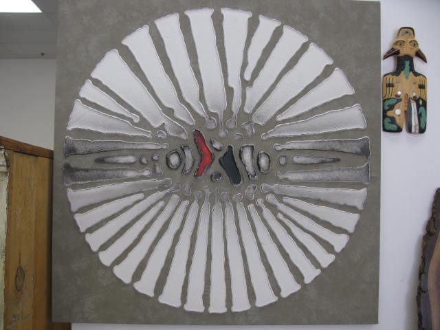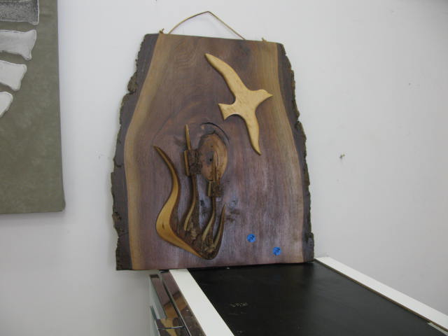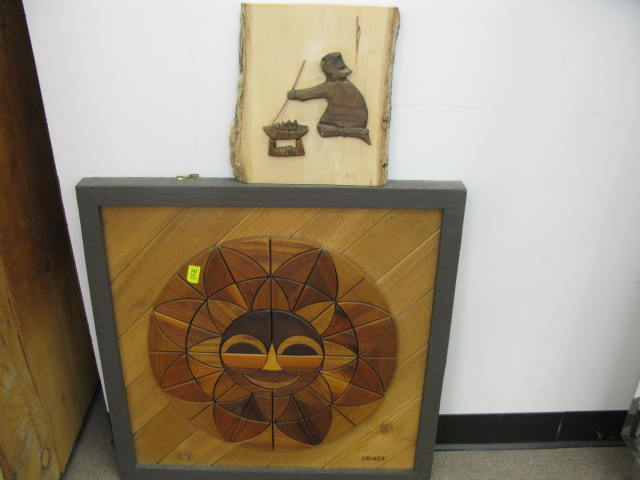 Three wall hangings to include a carved puzzle sun piece along with a flying bird and ceramic piece