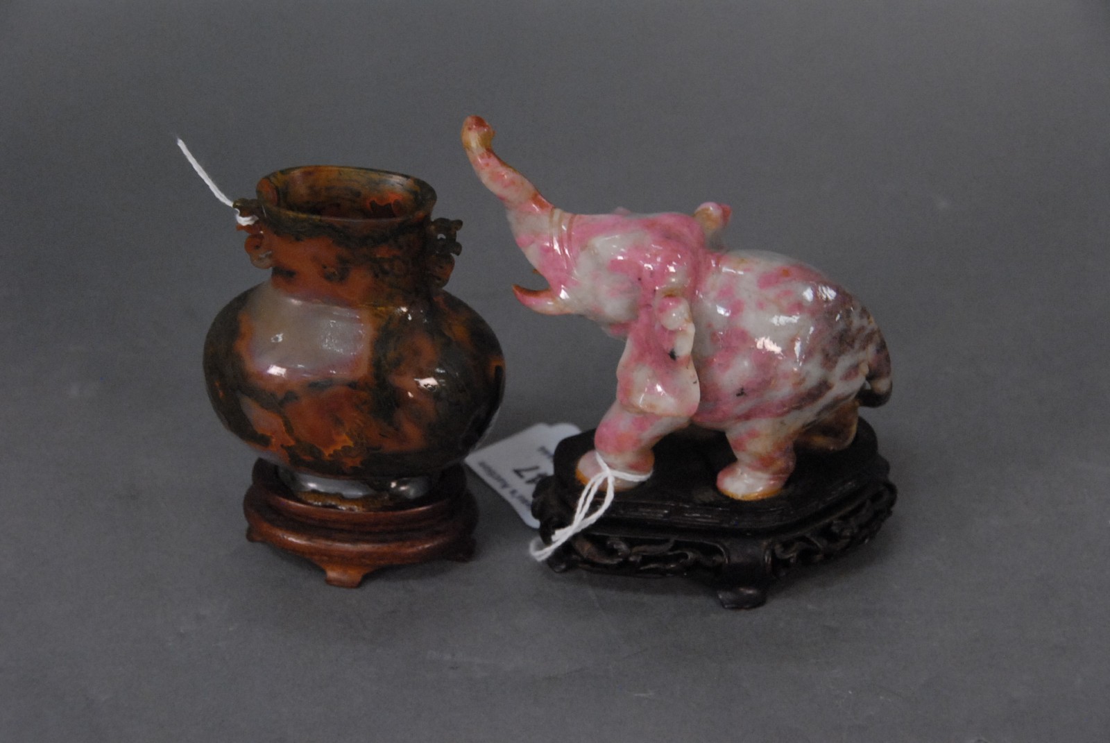 Two Chinese hardstone articles: an urn and an elephant with wood bases, 20th century.