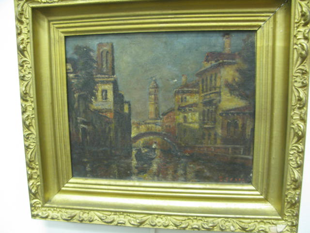 Two paintings, oil on board Venetian scene, and oil on canvas bust of woman