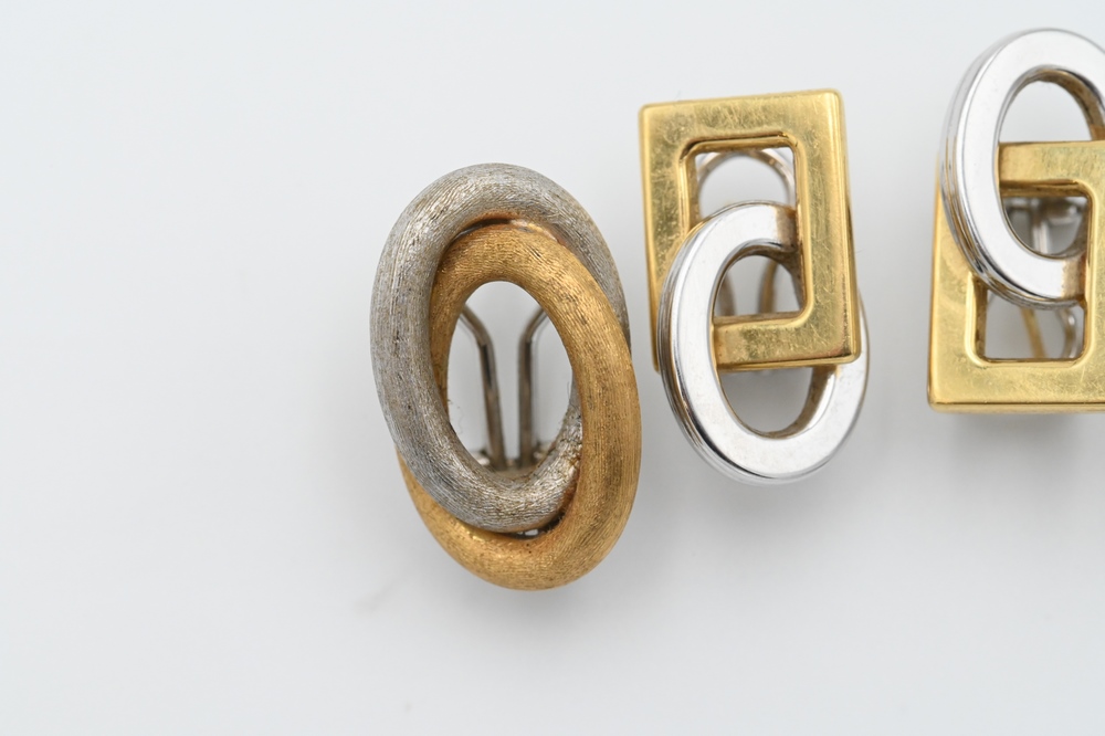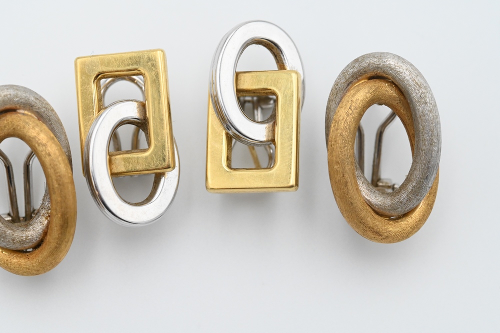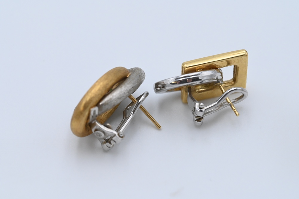 Two Pairs of 18 Karat White and Yellow Gold Pierced Earrings, to include one pair with ovals and rectangle; along with one pair with ovals, brush surface; 20 grams.