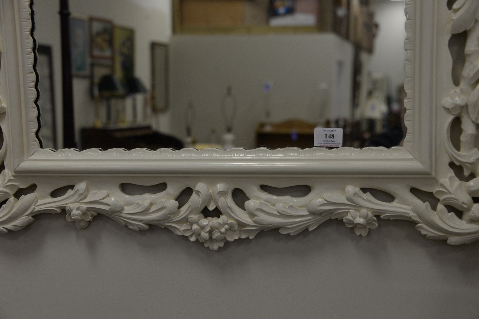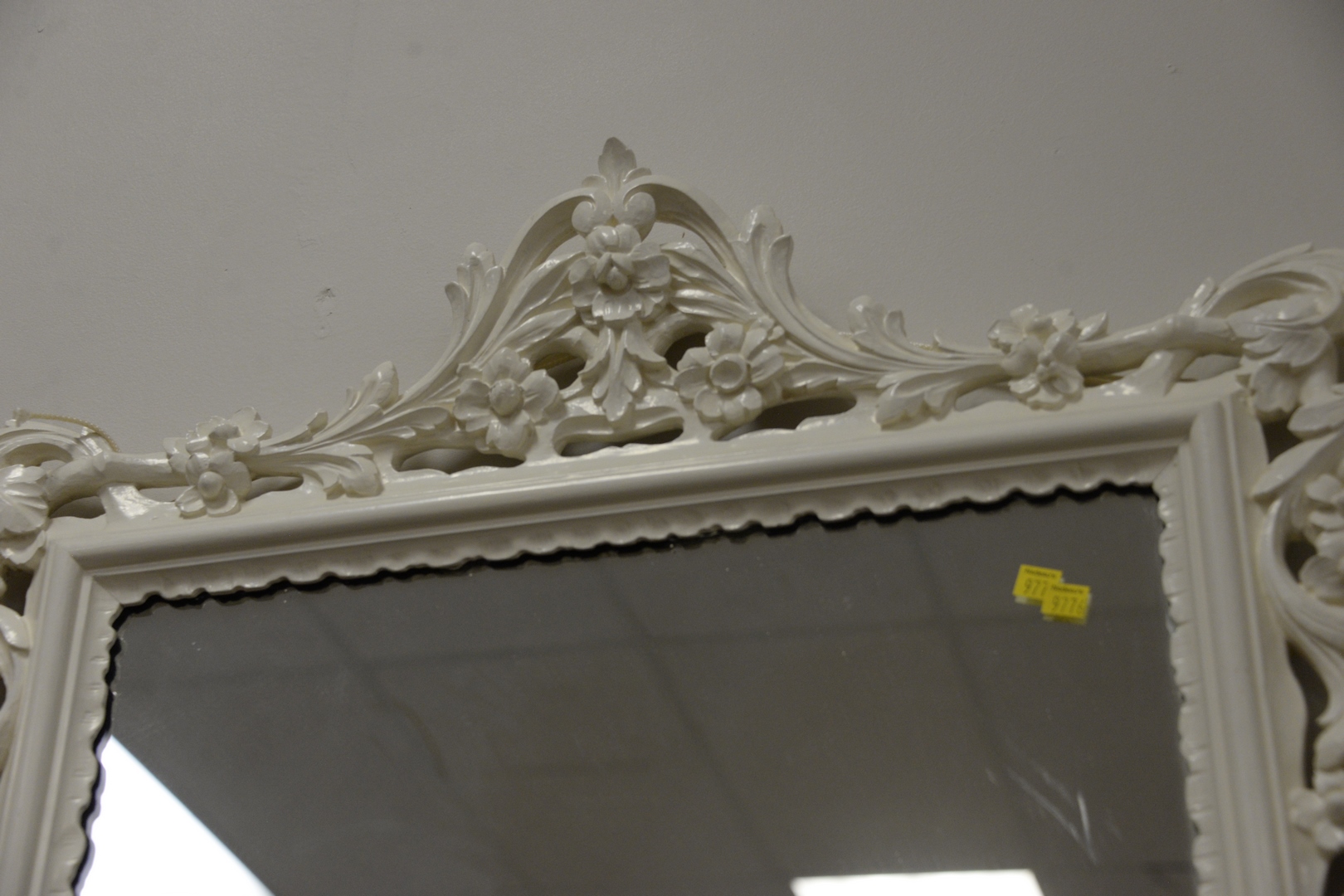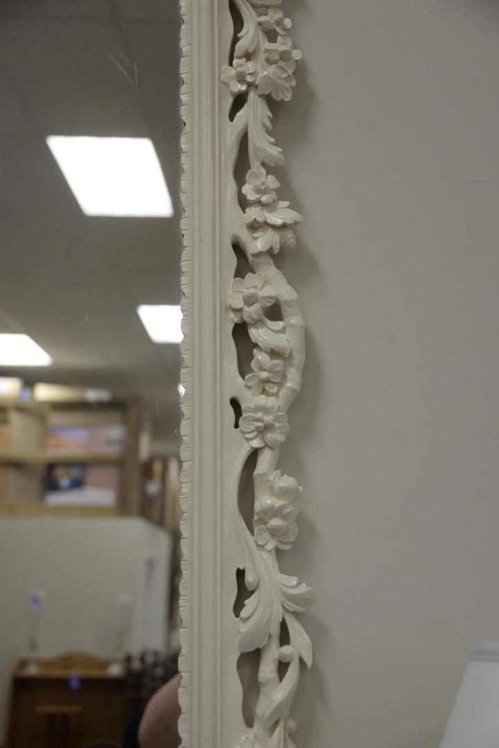 Lot 148: Chippendale Style Mirror, having white painted frame with carved scrolling vine and flowers, 50 x 30.