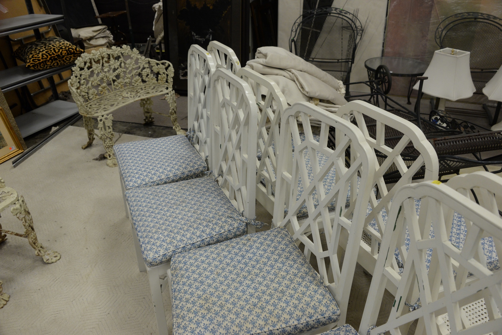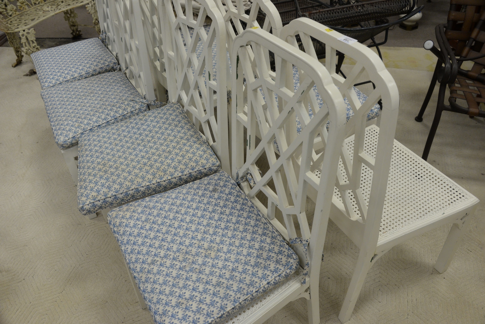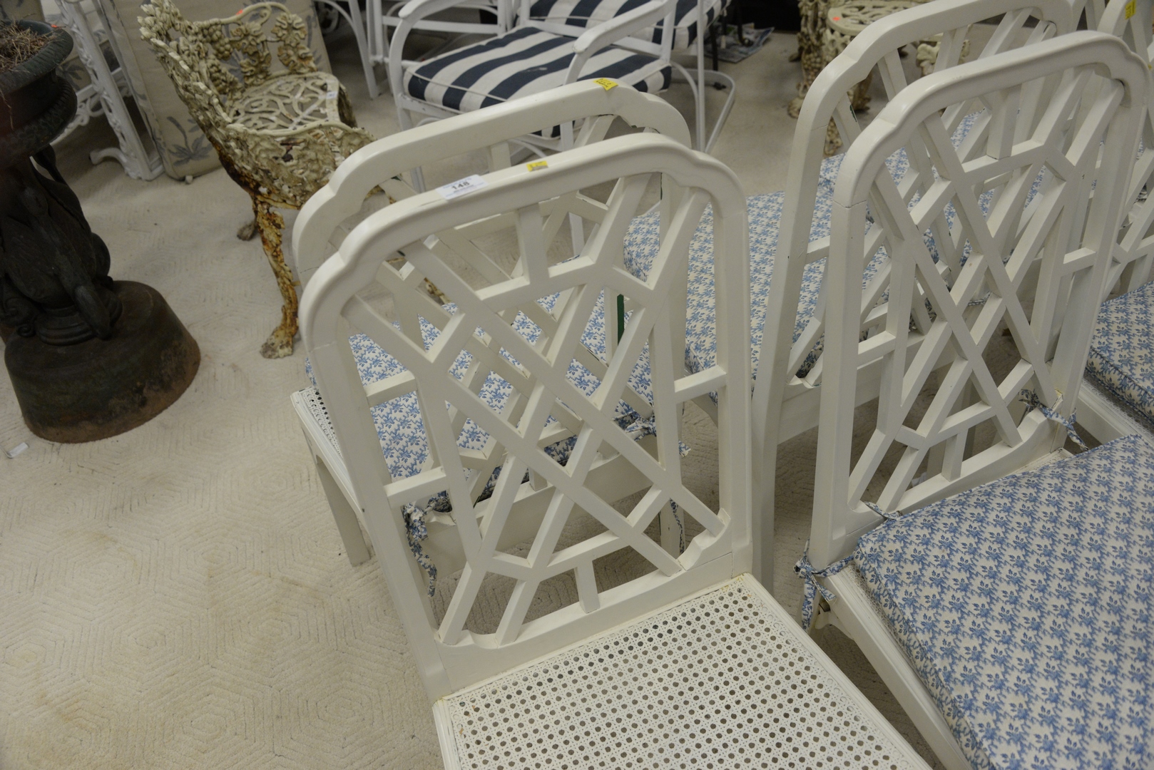 Lot 148: Eight George III Style ‘Chinese Chippendale’ White Painted Wood Caned Side Chairs, height 39 inches.