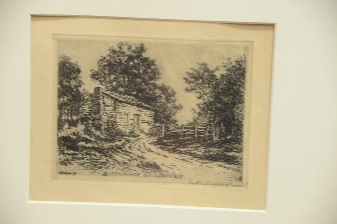 Lot 148: Four Gustave Adolph Hoffman 1869-1945 etchings including Birthplace of Lincoln, Country Road, Pyramid of Egypt, and a still life…