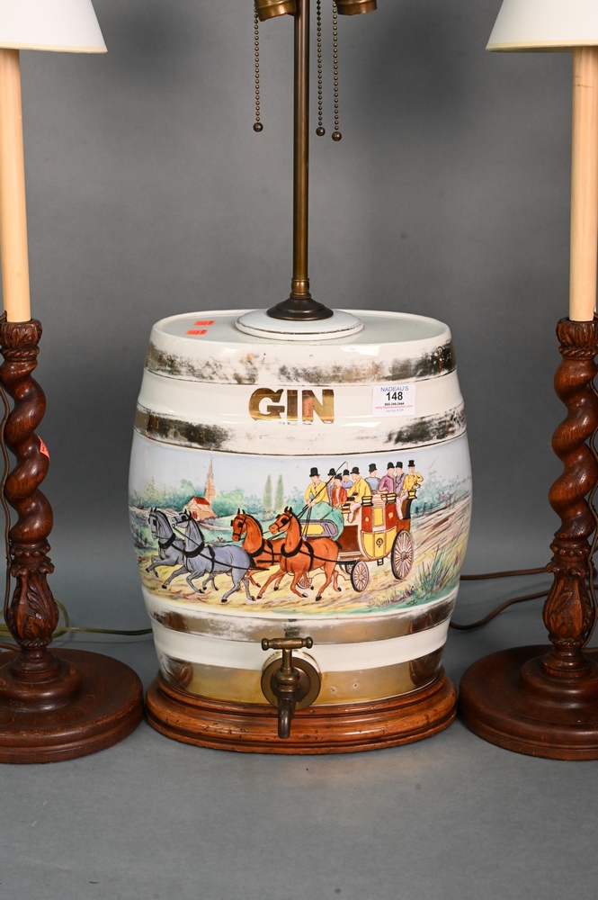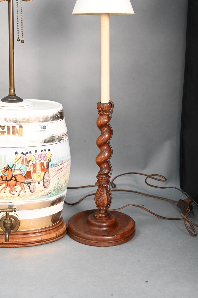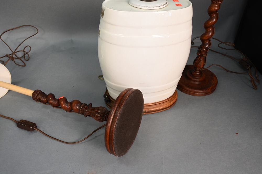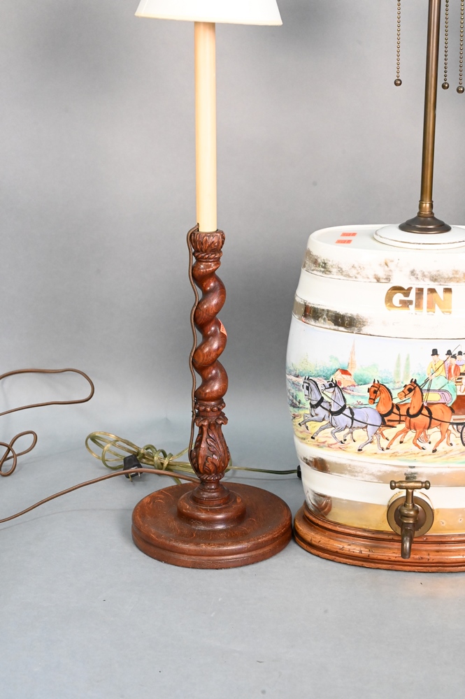 Group of Three Table Lamps, to include Victorian ceramic gin spirit barrel, having painted landscape with house and carriage; along with a pair of carved wood spiral candlestick lamps; gin height 30 inches, spiral height 28 inches.