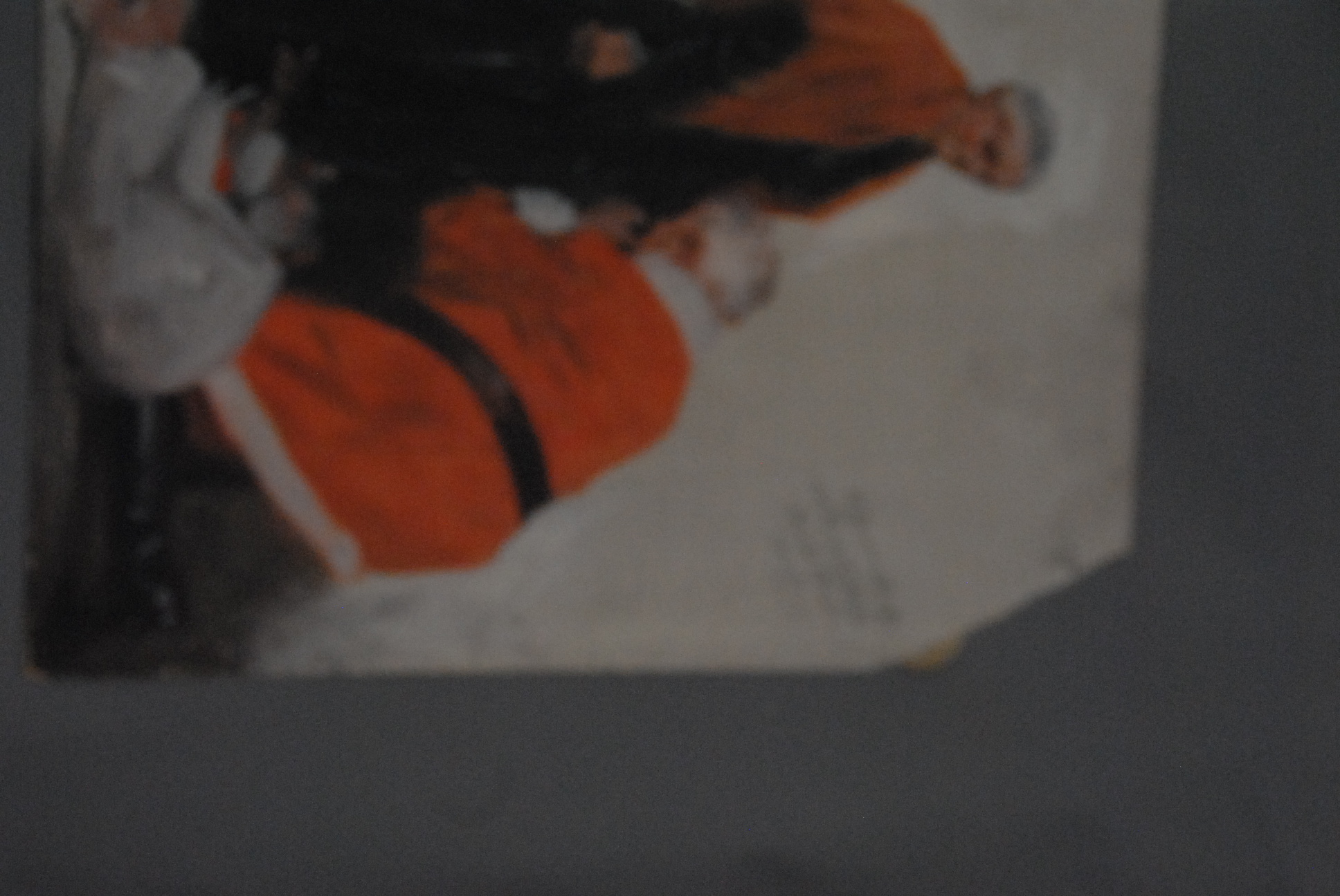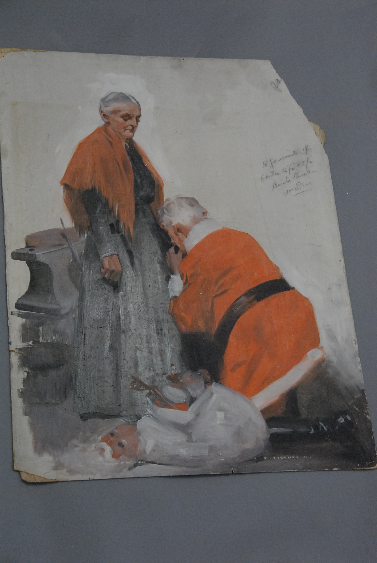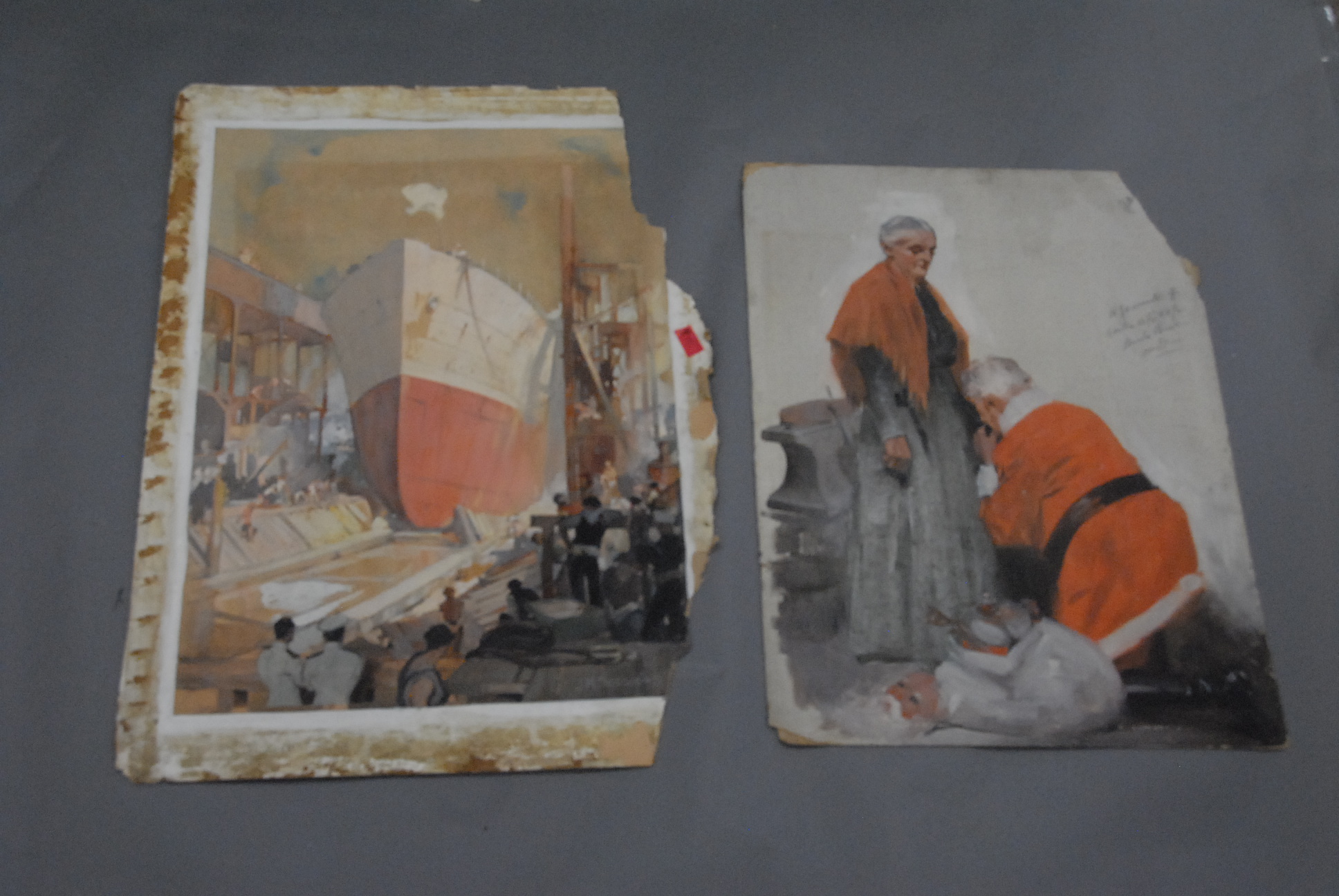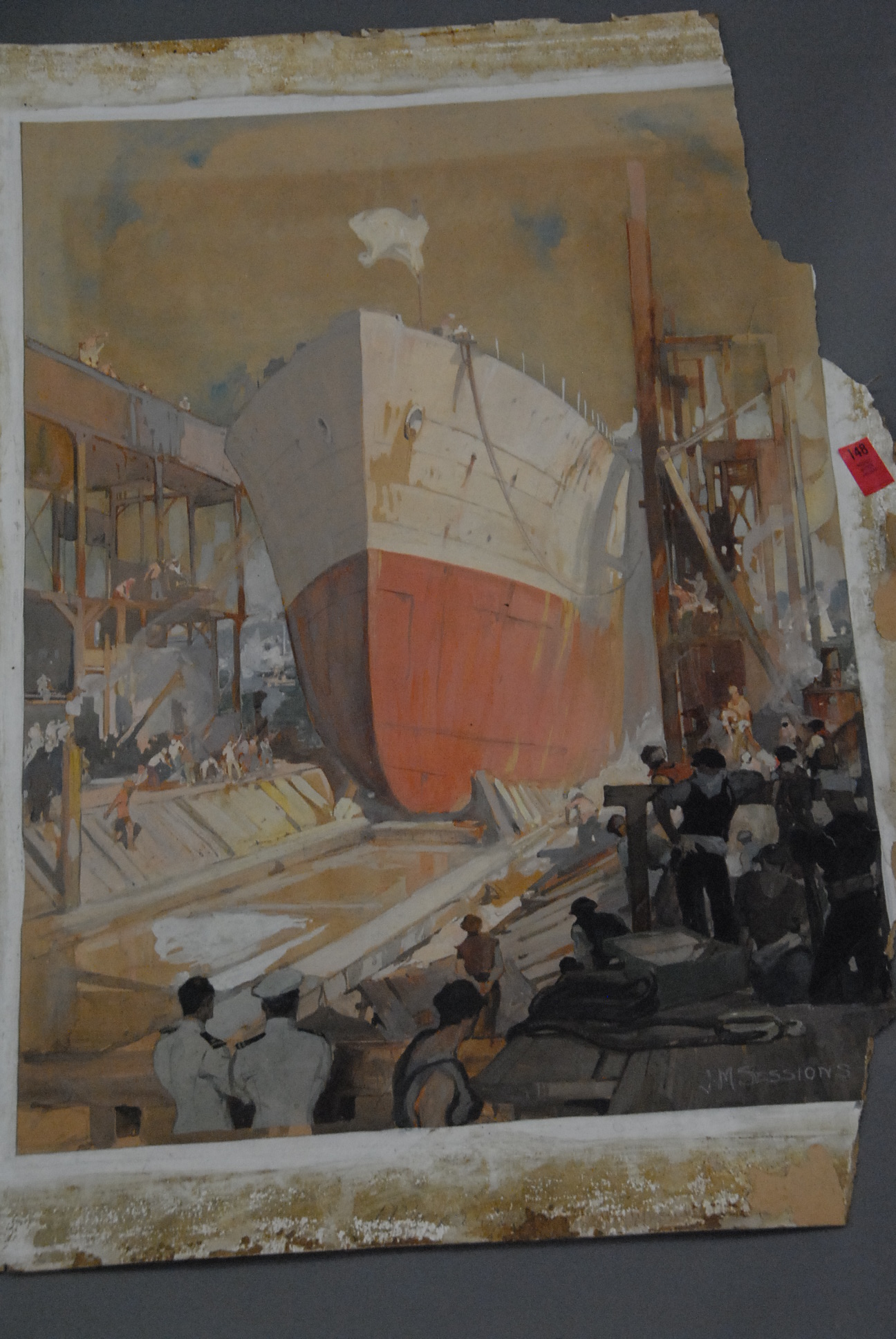 Illustrated art, two piece lot to include, watercolor of launching of a ship, signed J M Sessions, partially damaged, watercolor of Santa Claus with older woman probably also by J M Sessions