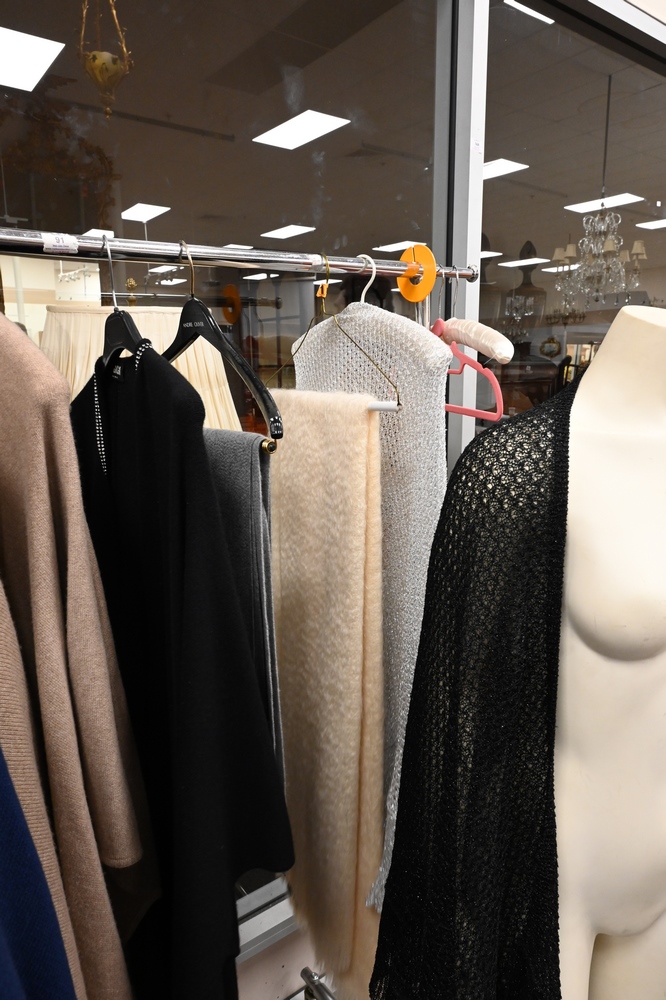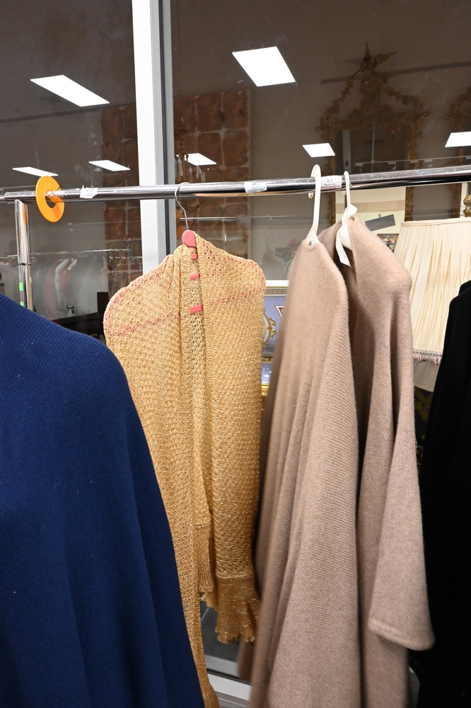 Lot 148: Lot of Capes, Shawls, and Wraps, to include ruffled Lurex knit, Scottish mohair, rhinestone collar by OGGI, cashmere, Donna Kendall …