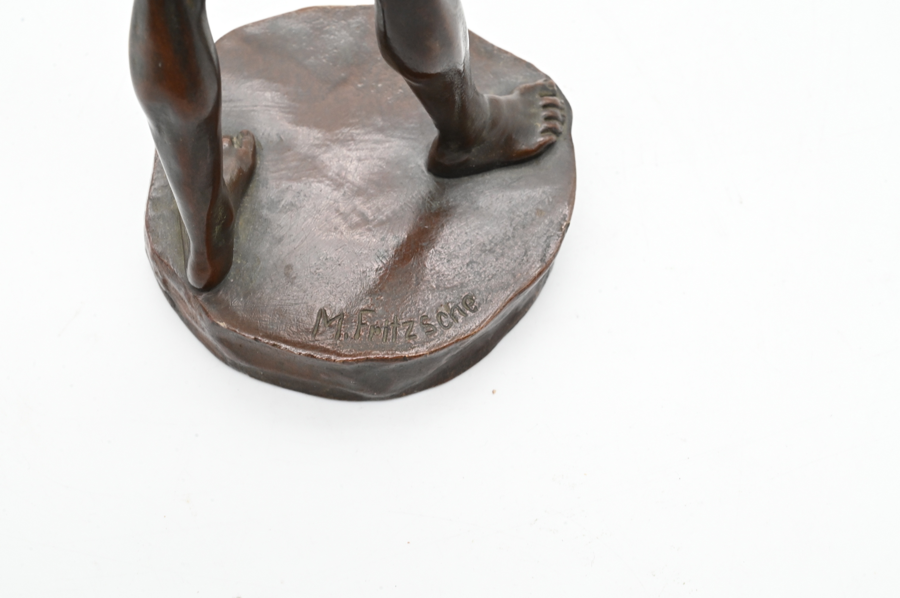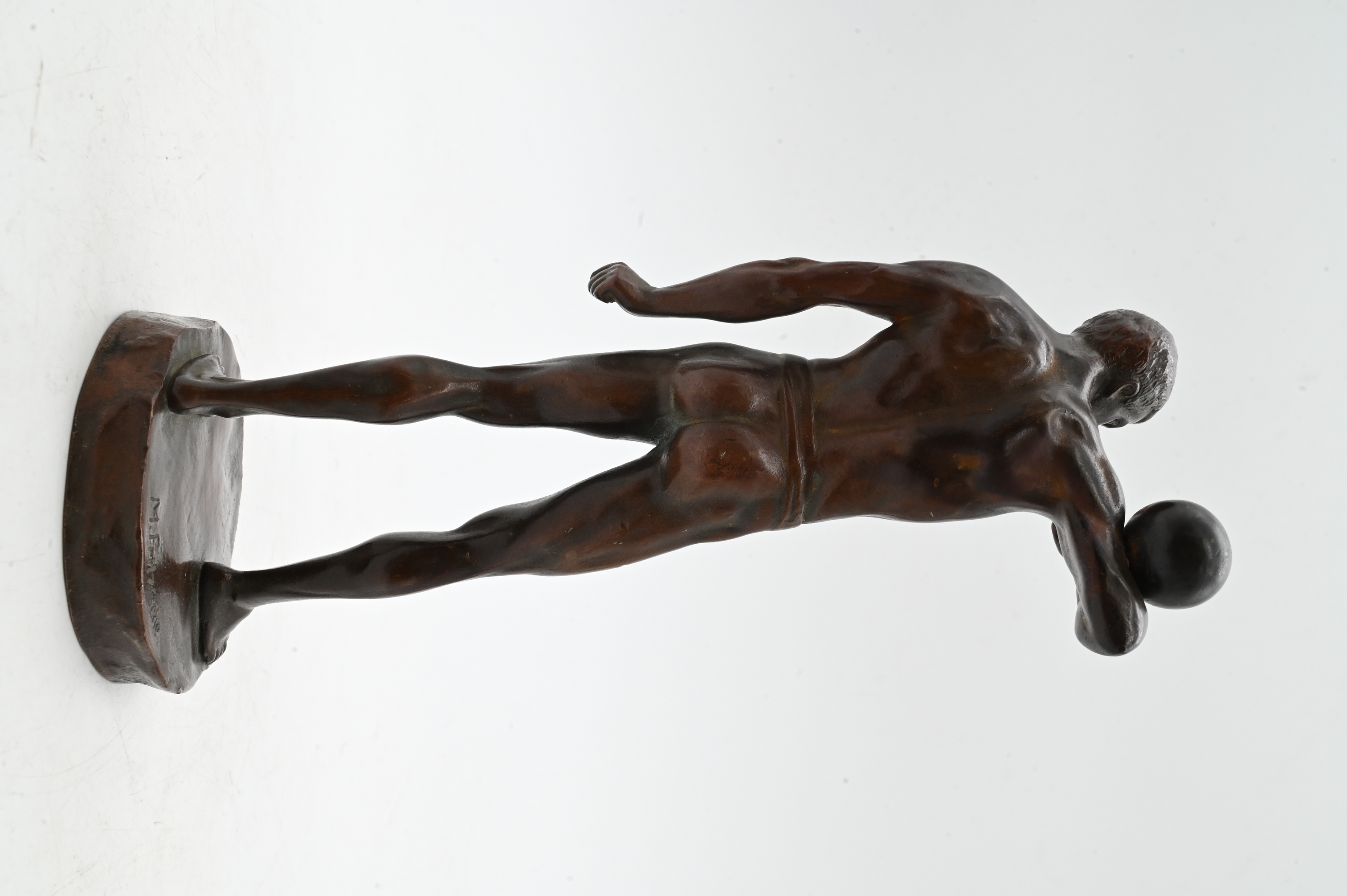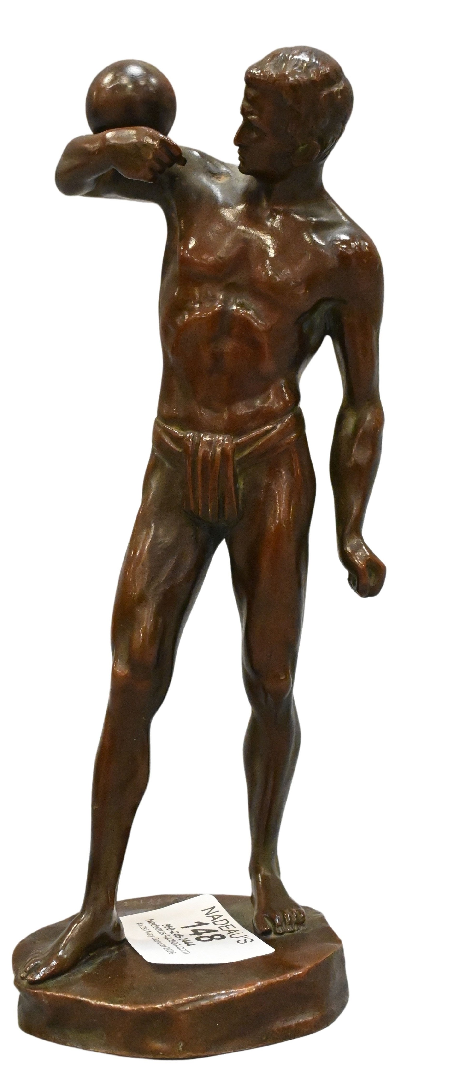 Bronze sculpture depicting a nude male figure supporting a sphere