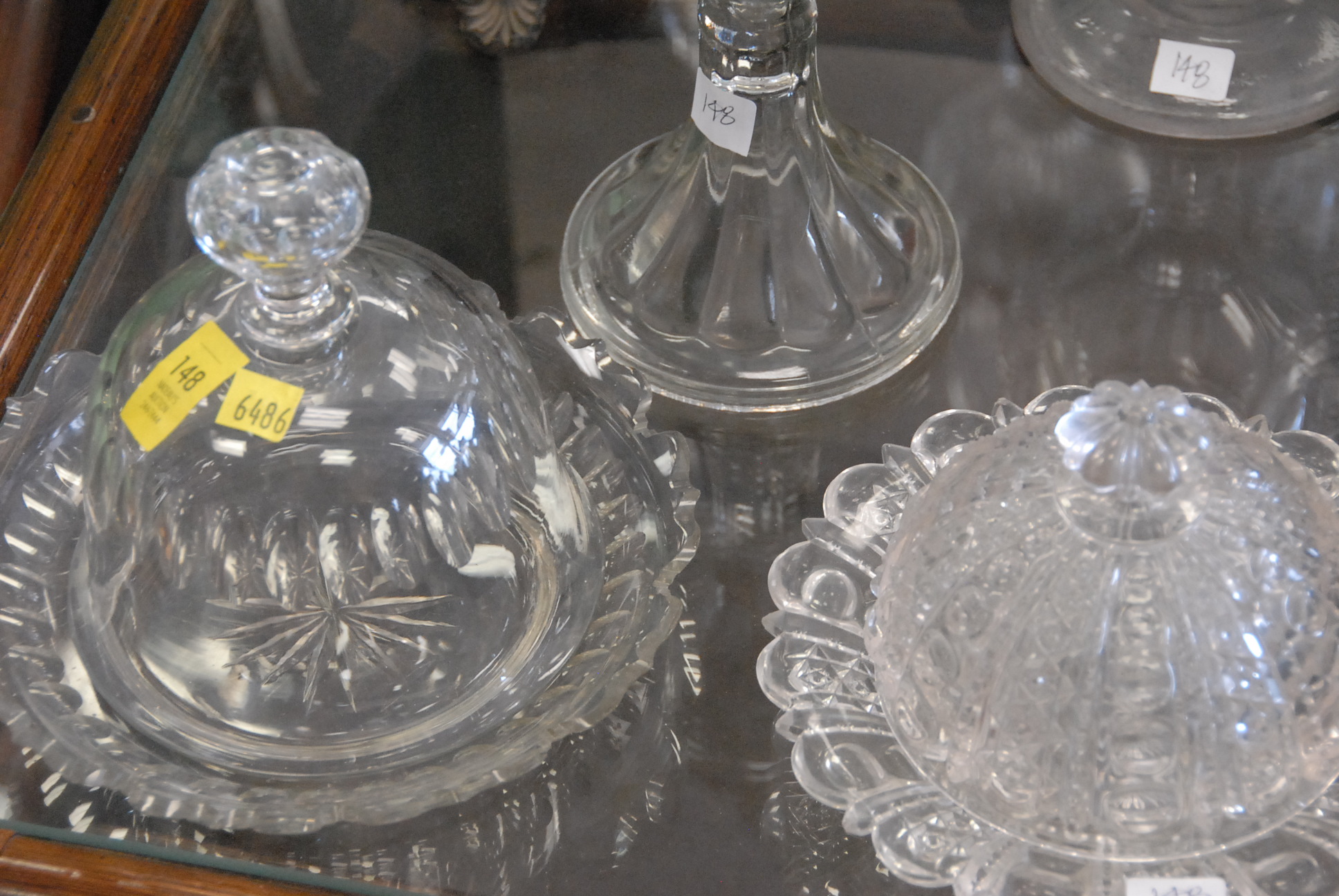 Lot 148: Nine piece lot two butter dishes, four oil lamps, pair of candlesticks, and four drawer spool cabinet