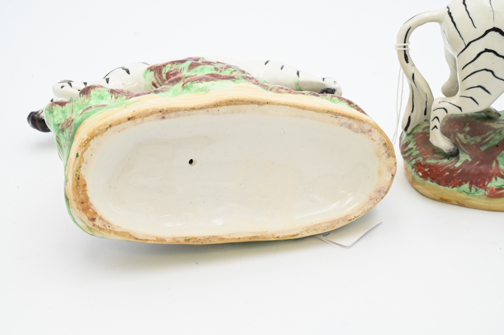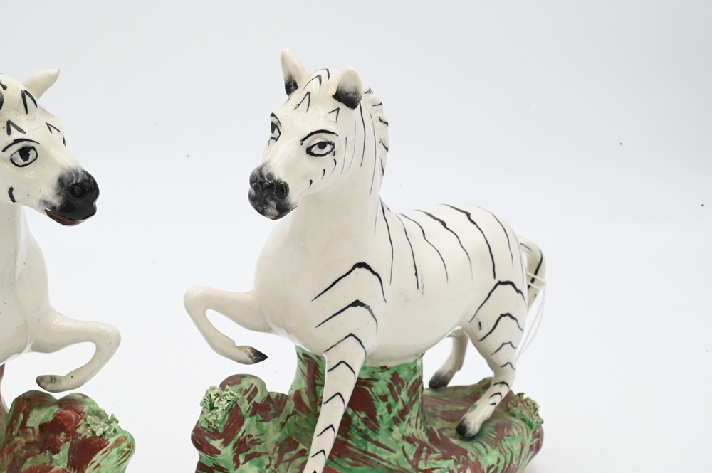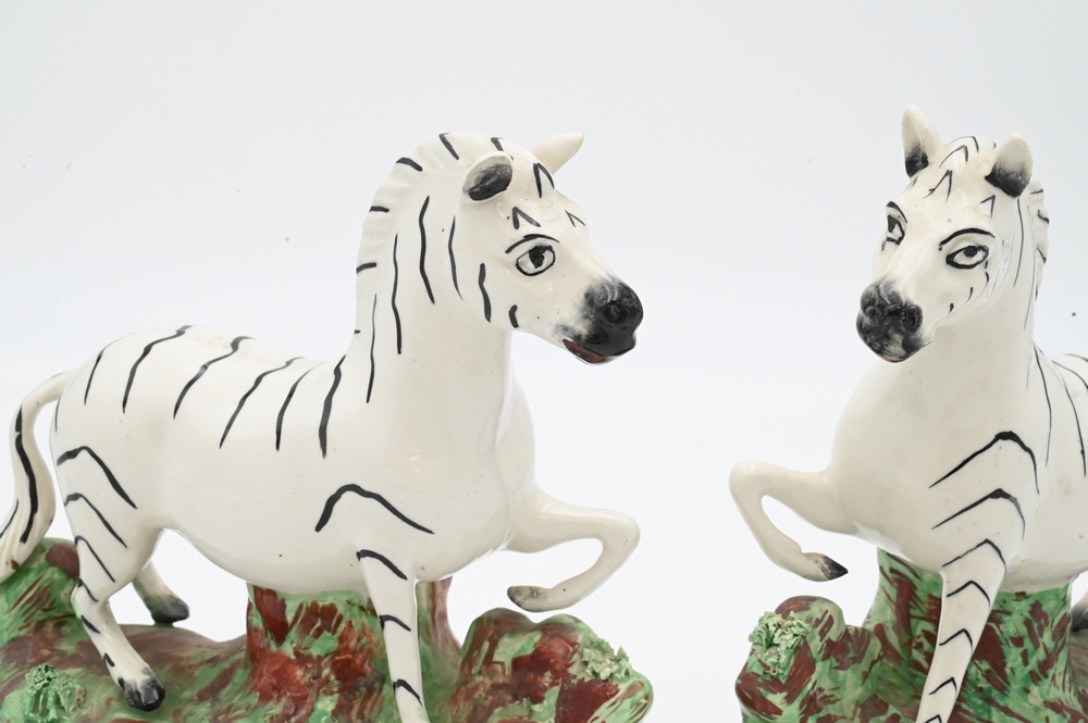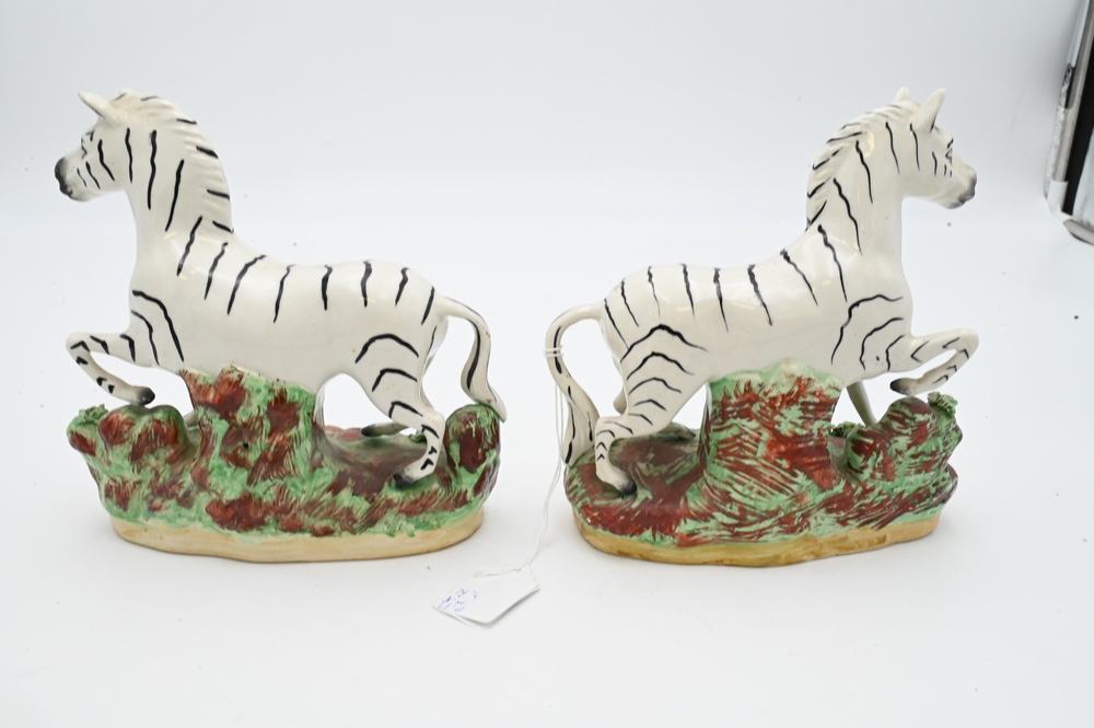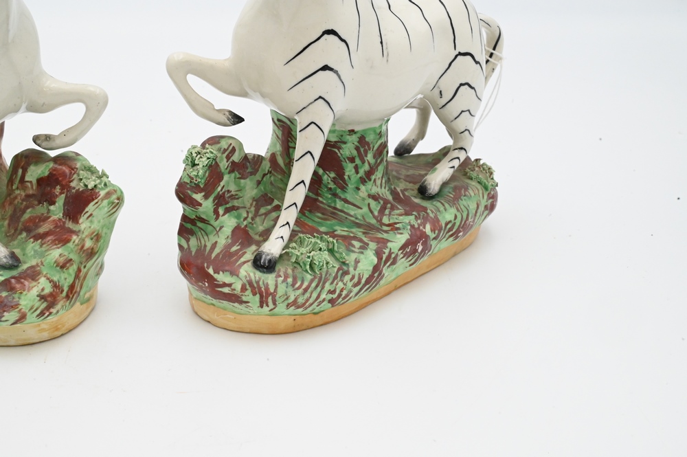Pair of English Staffordshire Zebra Figures, height 7 1/4 inches, length 7 1/2 inches.