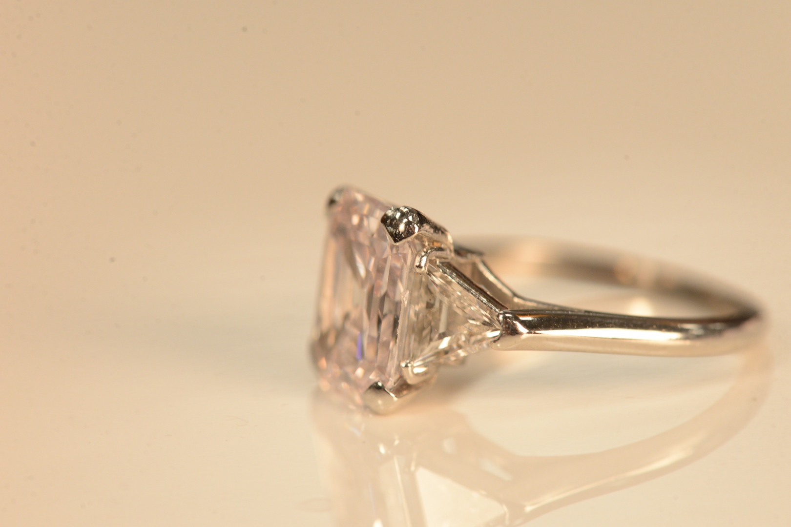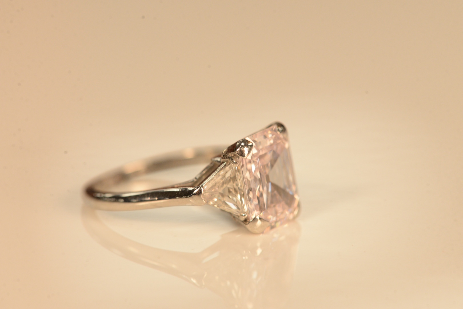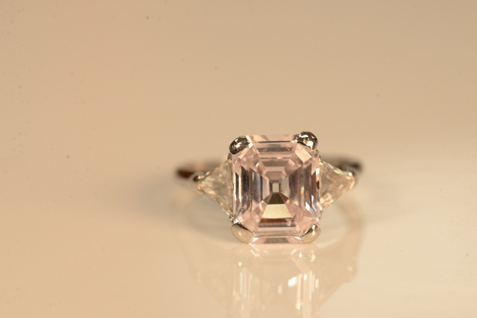 Platinum and Diamond Ring set with SI1 4.54 carat emerald cut diamond, flanked by trillion cut diamonds, Natural/Very Light Pink color, measuring 11.80 x 9.31 x 4.78 millimeters, G.I.A. report # 2211316330.