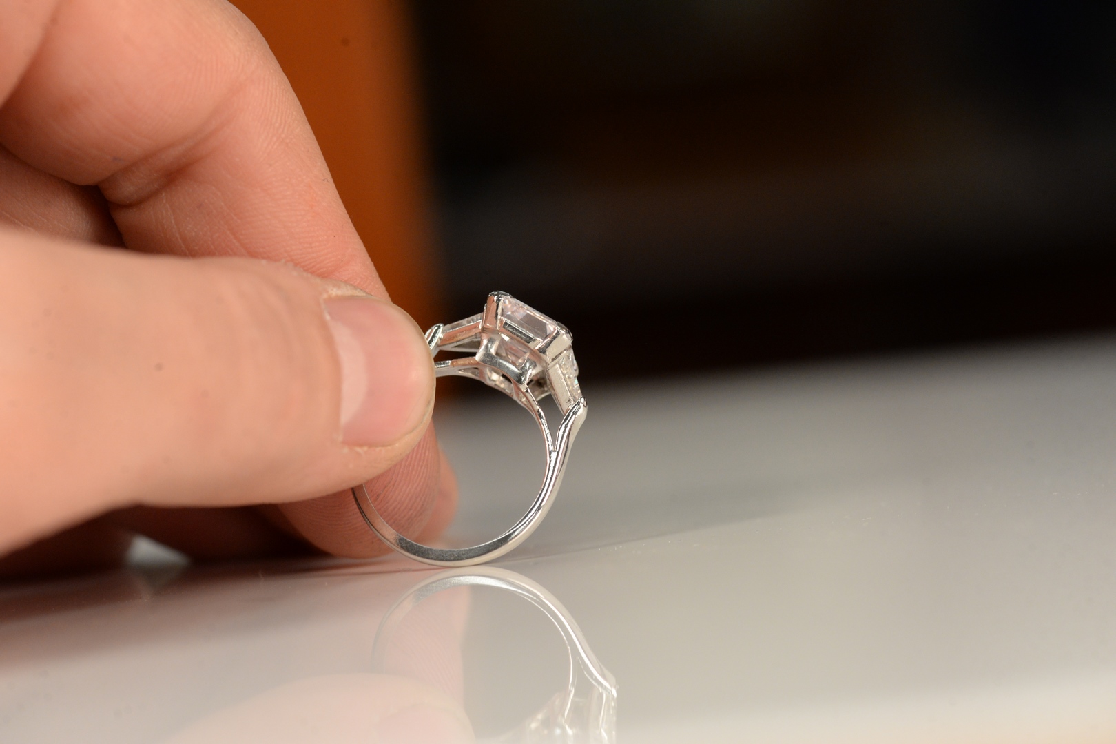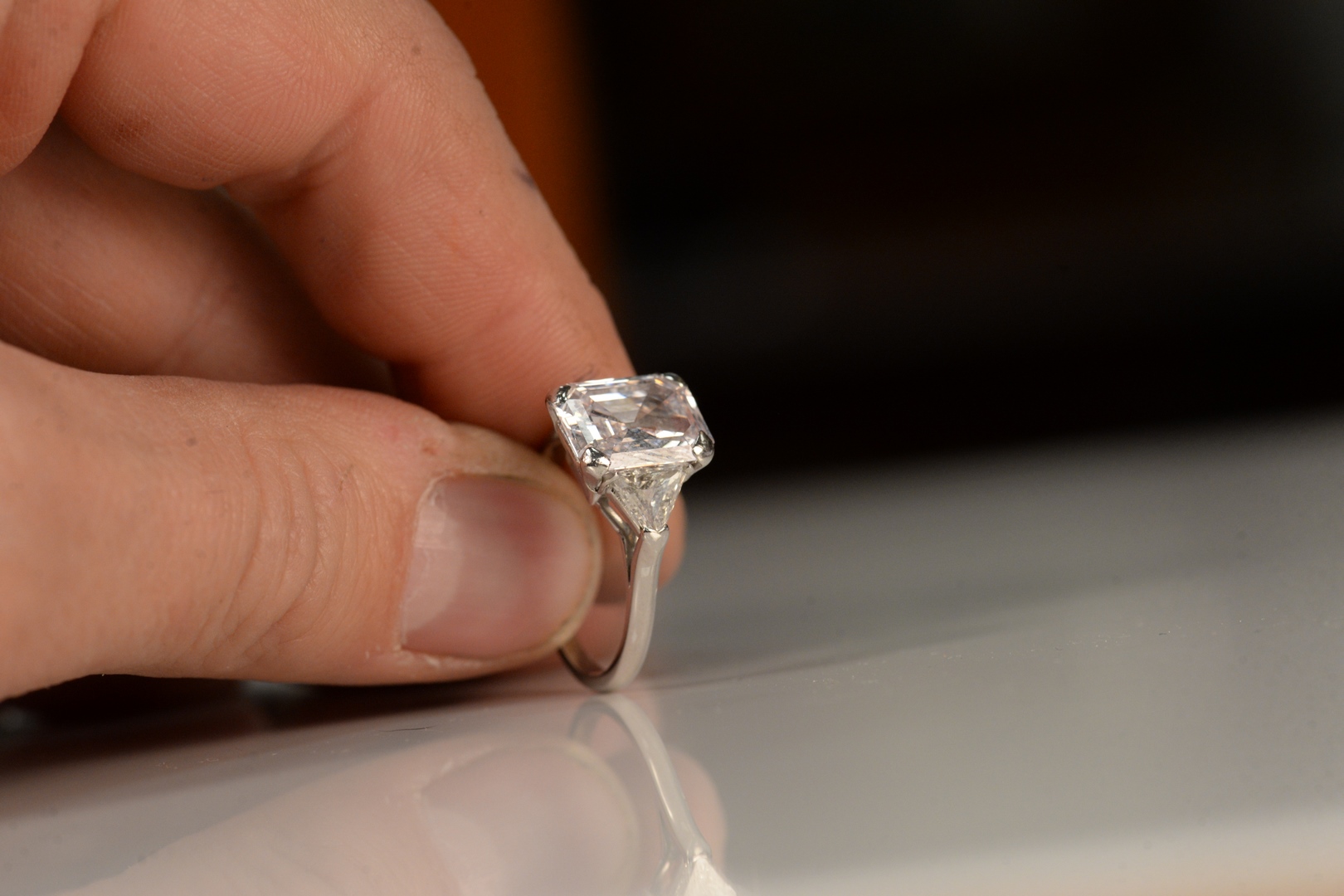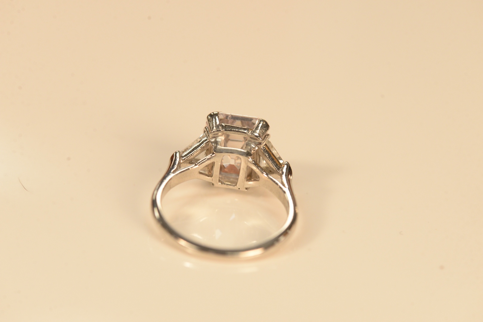 Lot 148: Platinum and Diamond Ring set with SI1 4.54 carat emerald cut diamond, flanked by trillion cut diamonds, Natural/Very Light…