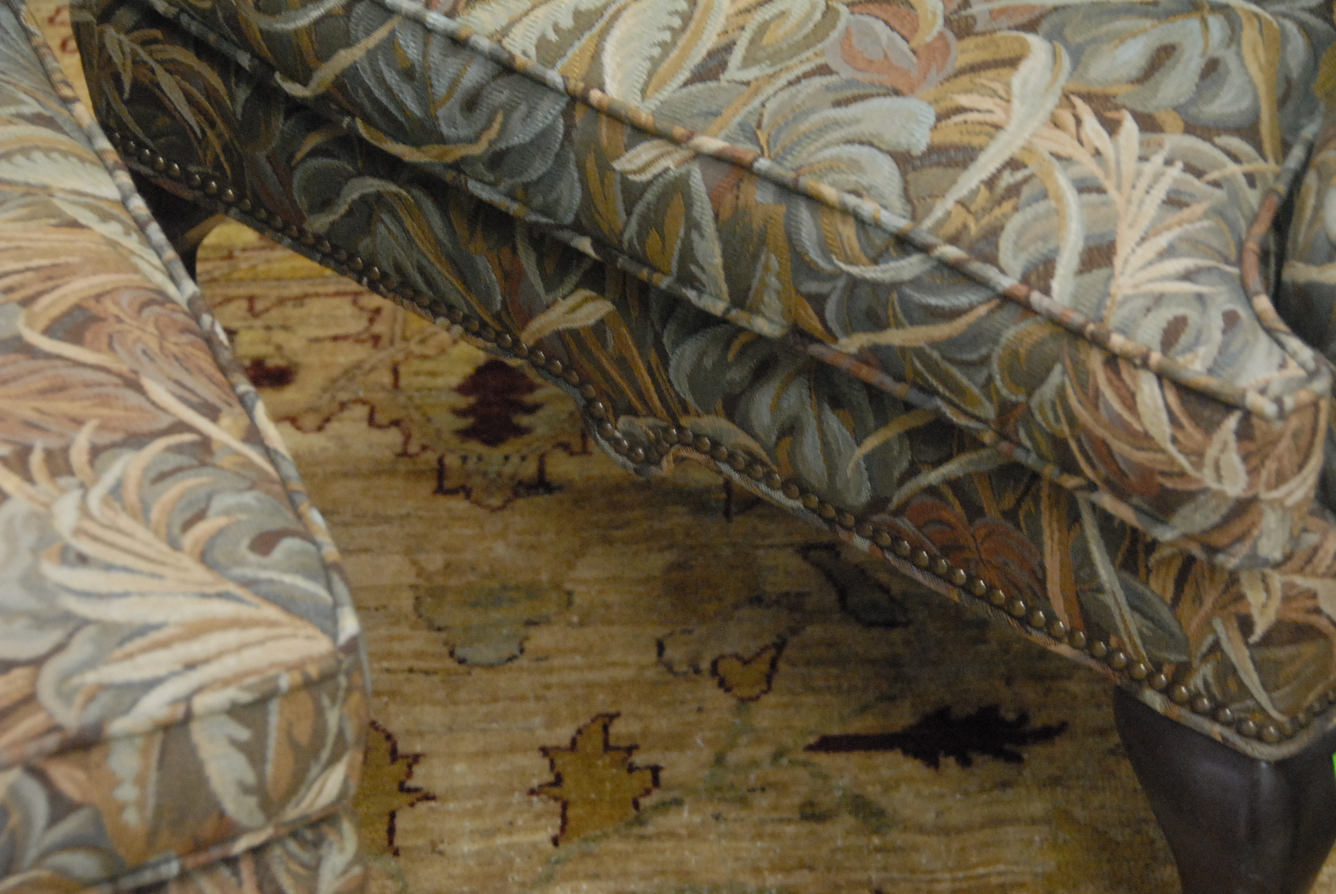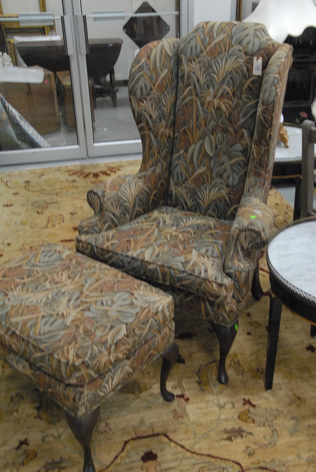 Queen Anne style wing chair and ottoman in tapestry style upholstery.