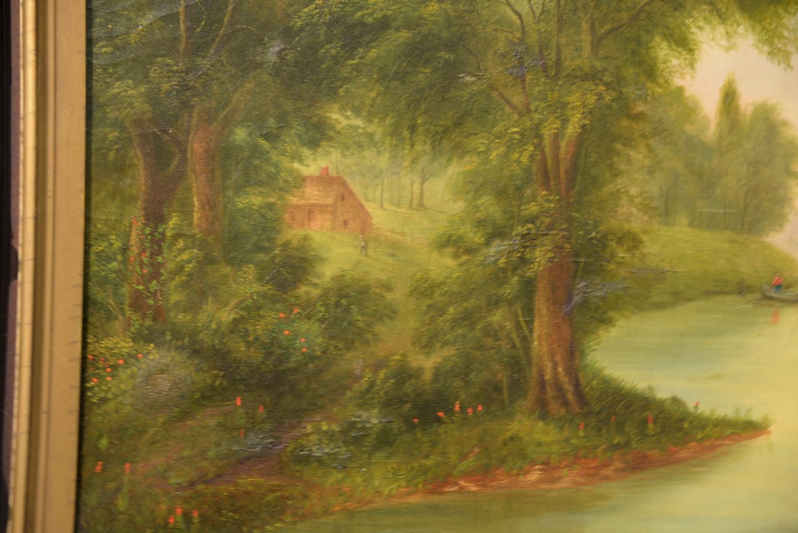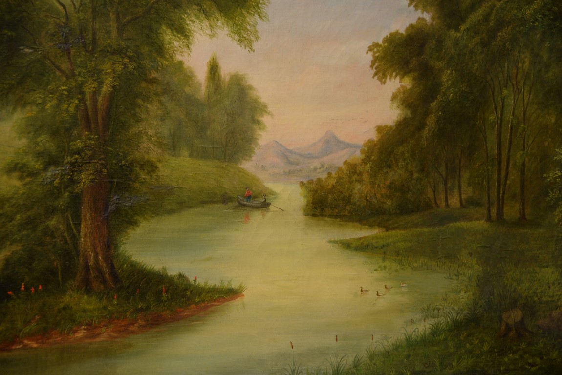 Lot 148: Spring Landscape pond with mountains in background oil on canvas unsigned 19th century 22 1/4 x 32 1/2