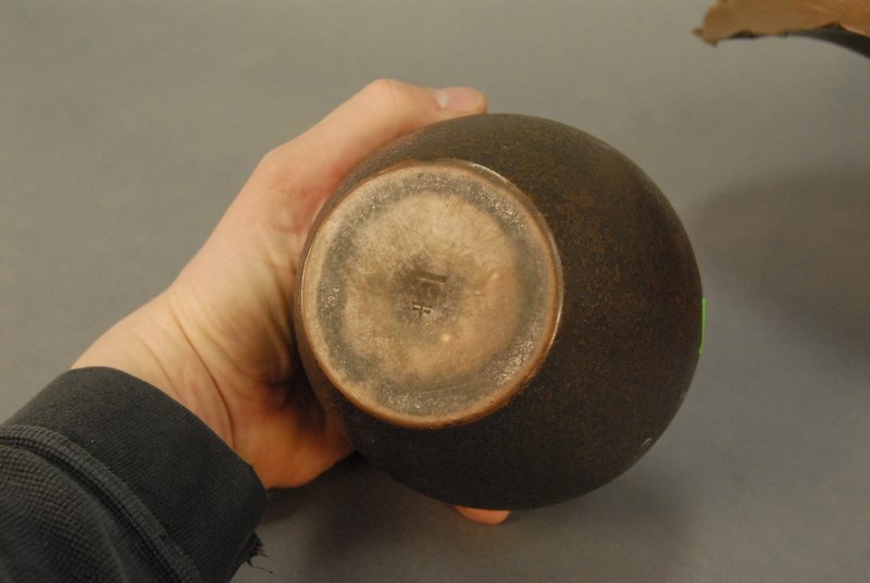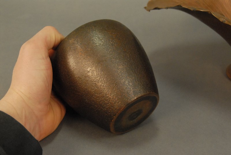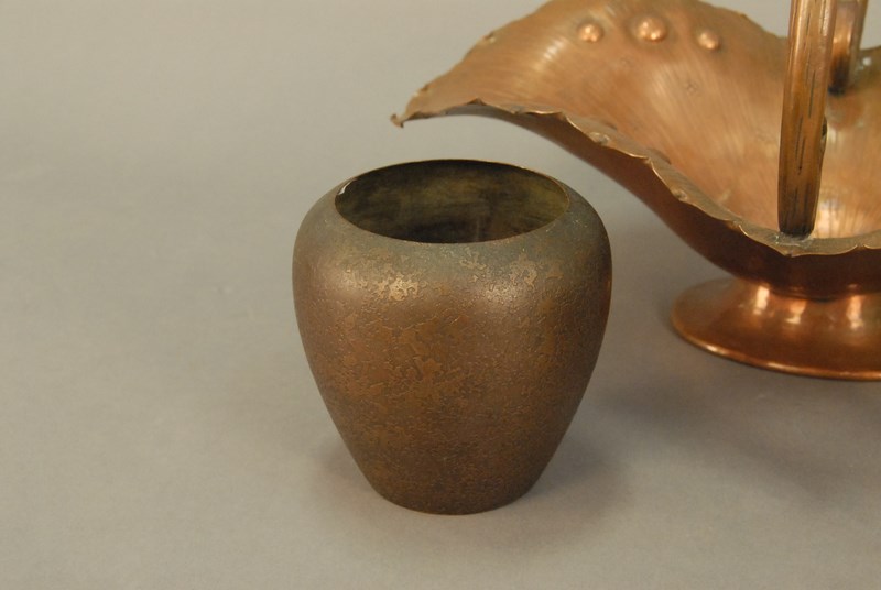 Lot 148: Three copper pieces to include Roycroft vase ht. 4 1/2in., hand hammered napkin holder, and copper basket.