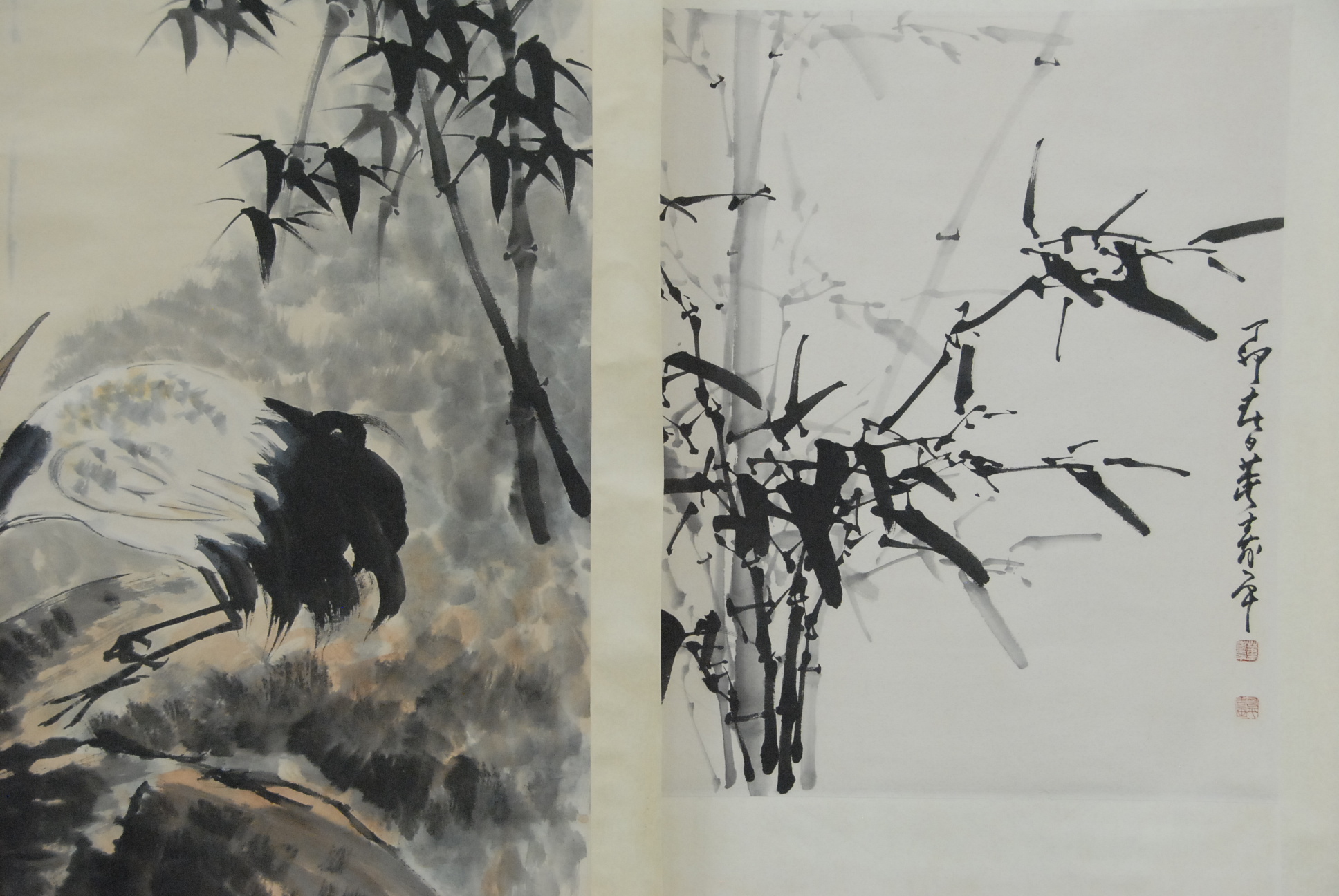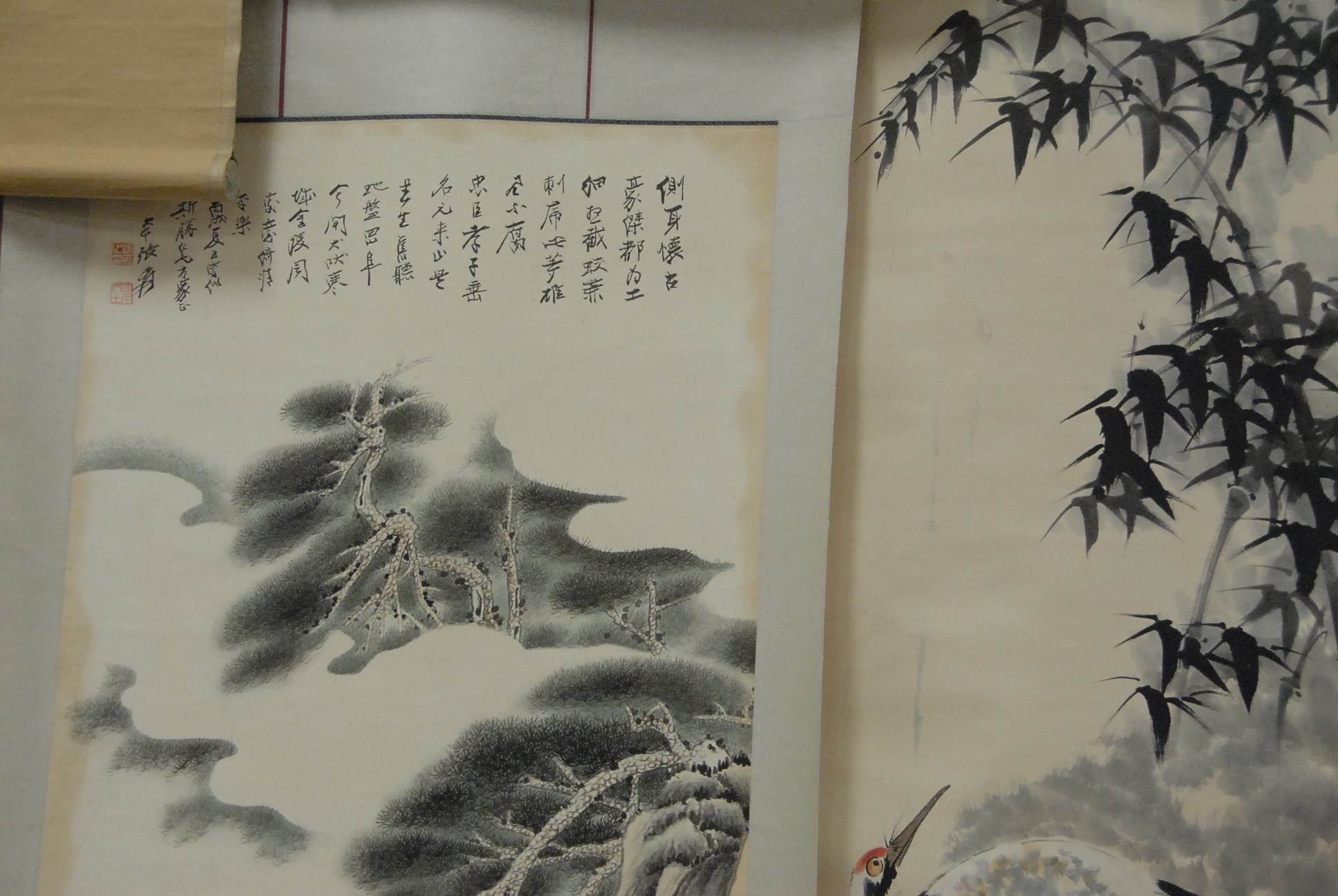 Three Oriental scrolls, one black and white of bamboo tree, one of crane and one with two scholars.