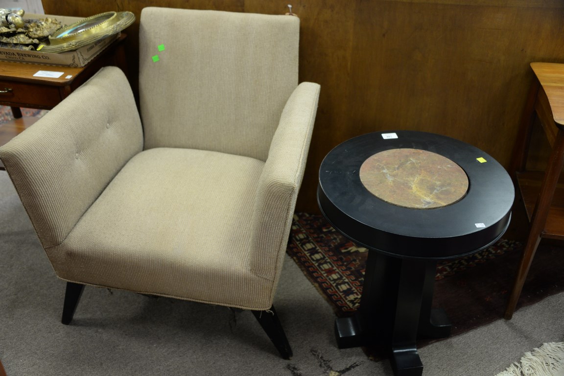 Lot 148: Two piece lot to include a Henredon marble top end table and upholstered armchair. table: ht. 22 in. dia. 18 in.