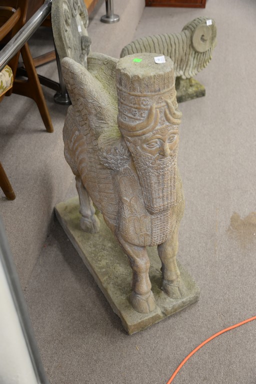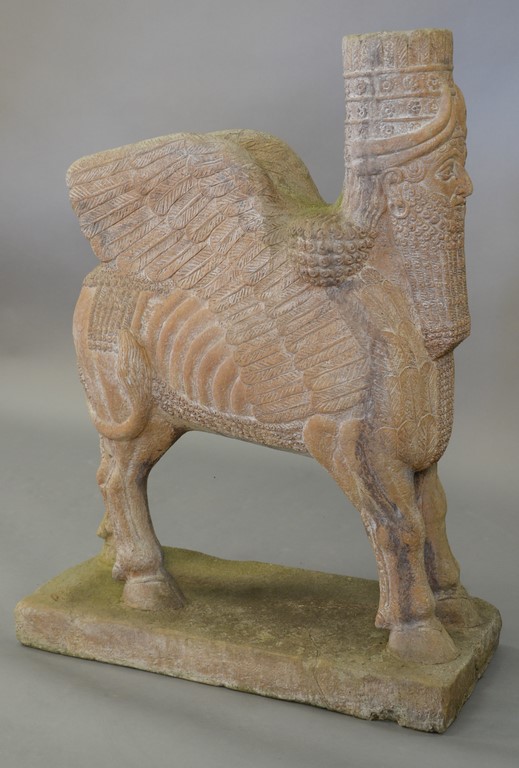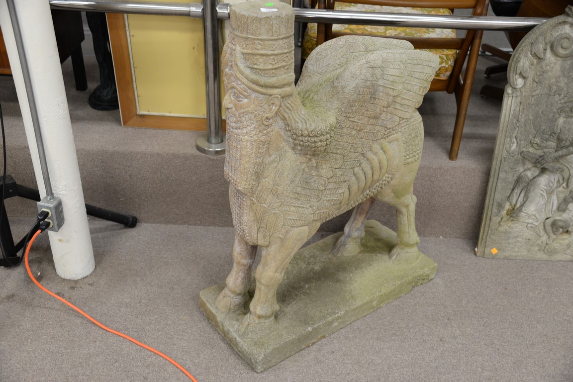 Cement figure with wings, bearded man, and hoof feet. ht. 39in., lg. 30in.