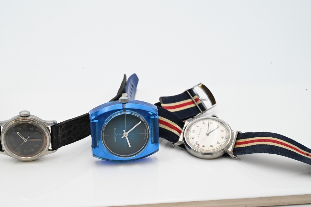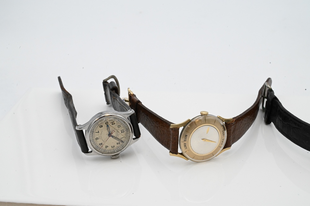Lot 149: Five Vintage Wristwatches, to include Movado, Mido, Lord Elgin, etc.; along with a pair of 14 karat gold and purple stone pierced ea…