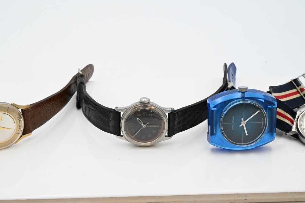 Five Vintage Wristwatches, to include Movado, Mido, Lord Elgin, etc.; along with a pair of 14 karat gold and purple stone pierced earrings.