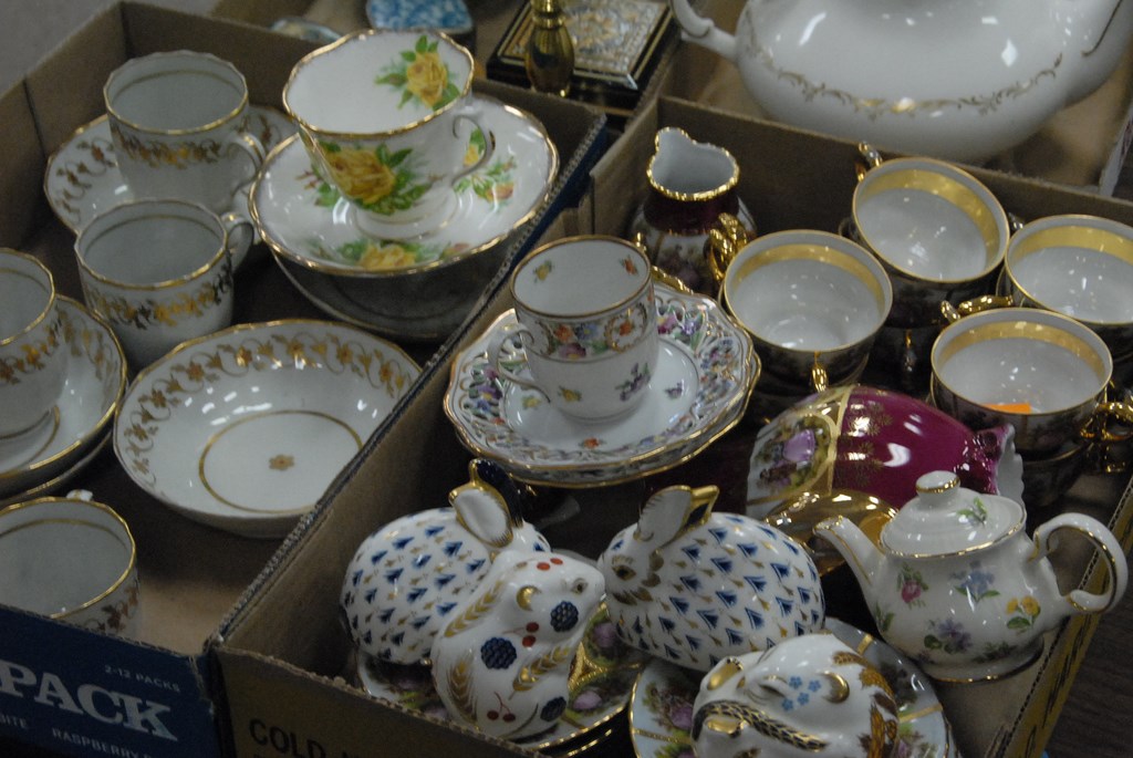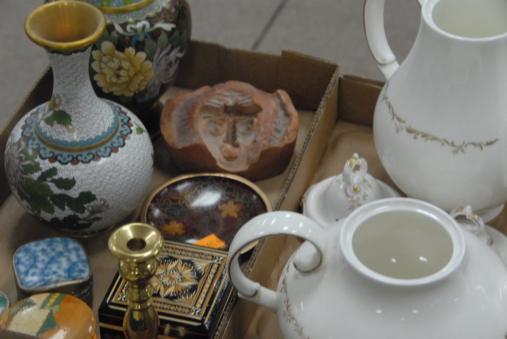 Four box lots: demitasse cups and saucers, teapot, coffeepot, two cloisonn vases, small boxes, candlestick, Royal Crown Derby rabbits, etc.