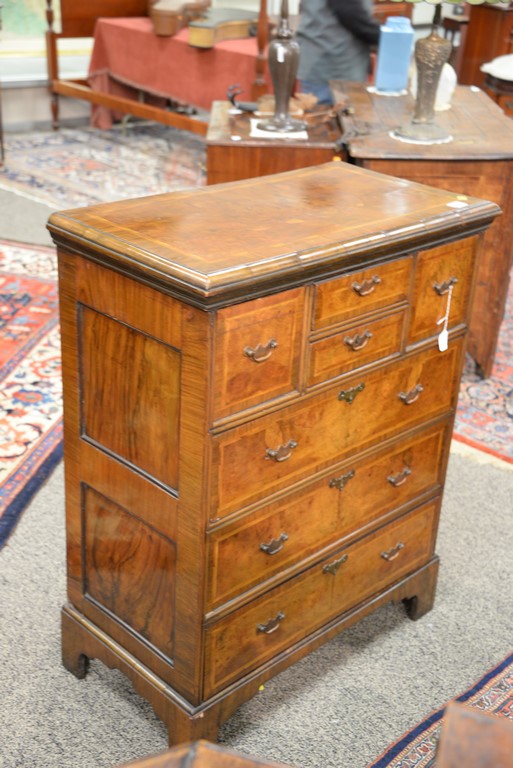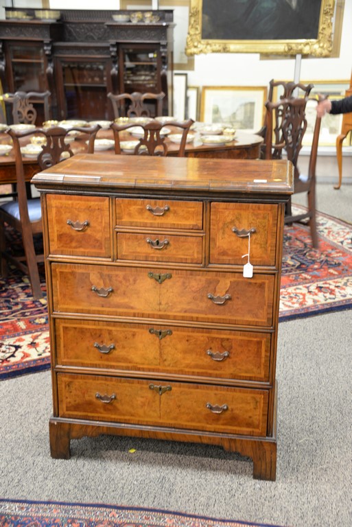 George II walnut veneered chest having two center short drawers flanked by two deep drawers over three long drawers set on bracket base, 18th century. ht. 40 1/2 in. case wd. 30 in. dp. 17 in. Provenance: The Estate of Natalie Rafferty