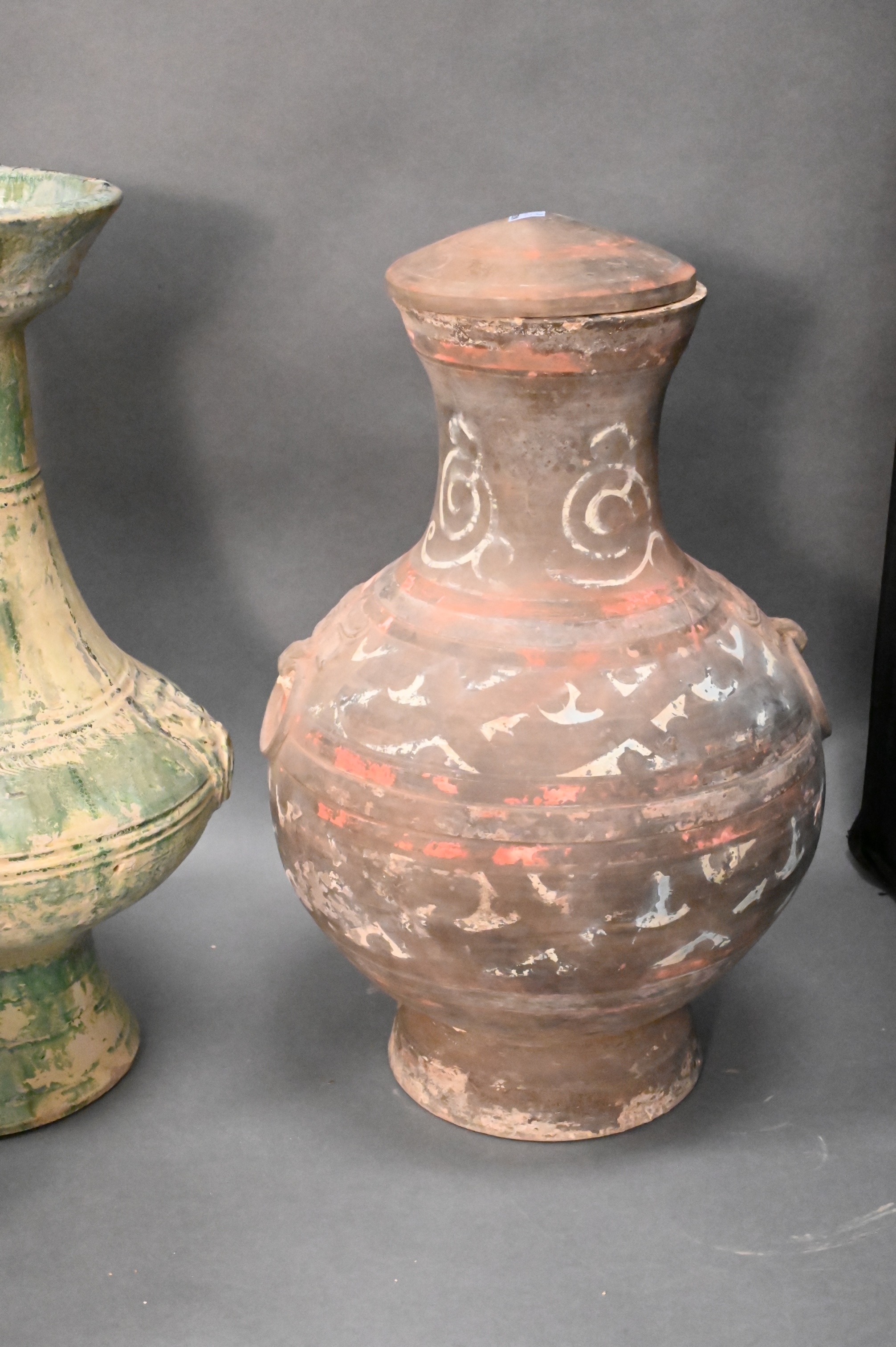 pair of unglazed covered urns having Foo lion mask handles along with a pair of