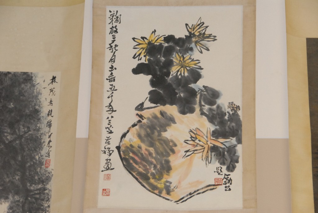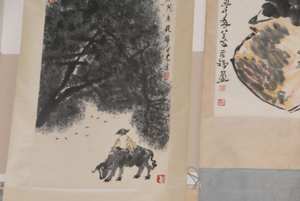 Lot 149: Group of three Oriental scrolls one of boy on buffalo 27 x 17, one still life of flowers 27 x 17, and watercolor on silk 37 x …