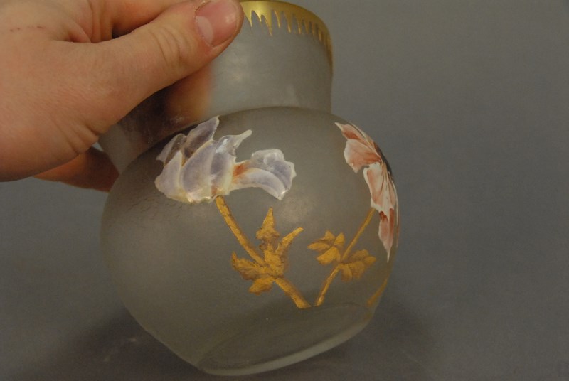 Lot 149: Mont Joye vase, acid etched with enameled flowers. ht. 5in.