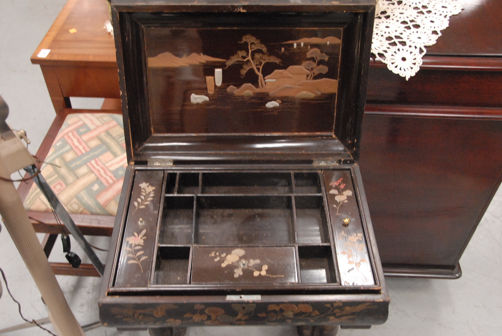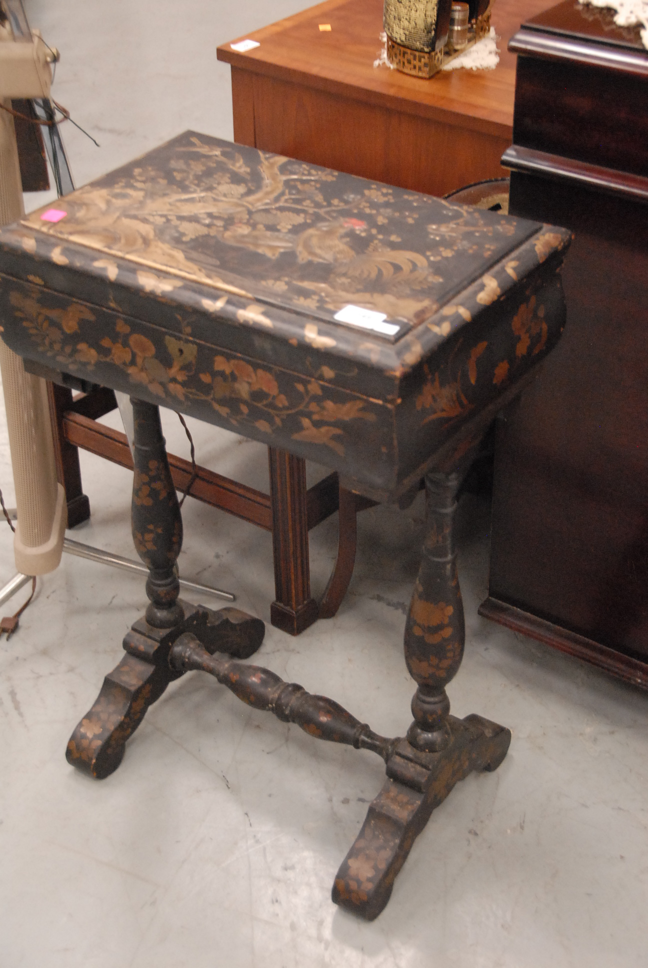 Oriental black lacquered and gold decorated sewing stand, ht. 27 1/2.