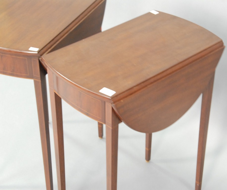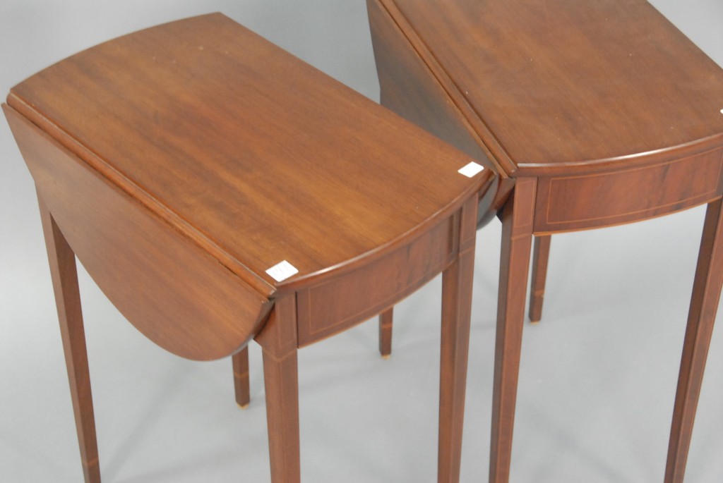 Pair of Margolis mahogany Pembroke tables with oval drop leaves, one drawer, line inlay. height 27in.