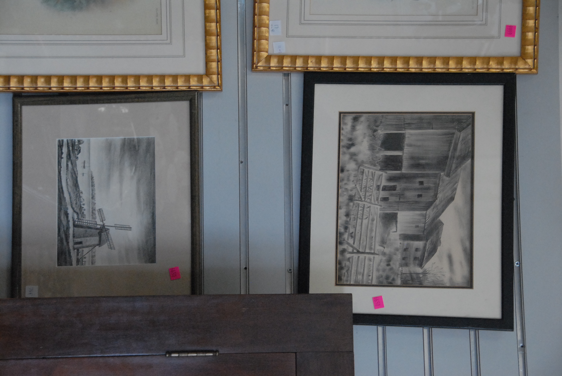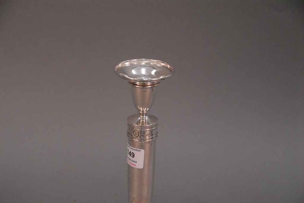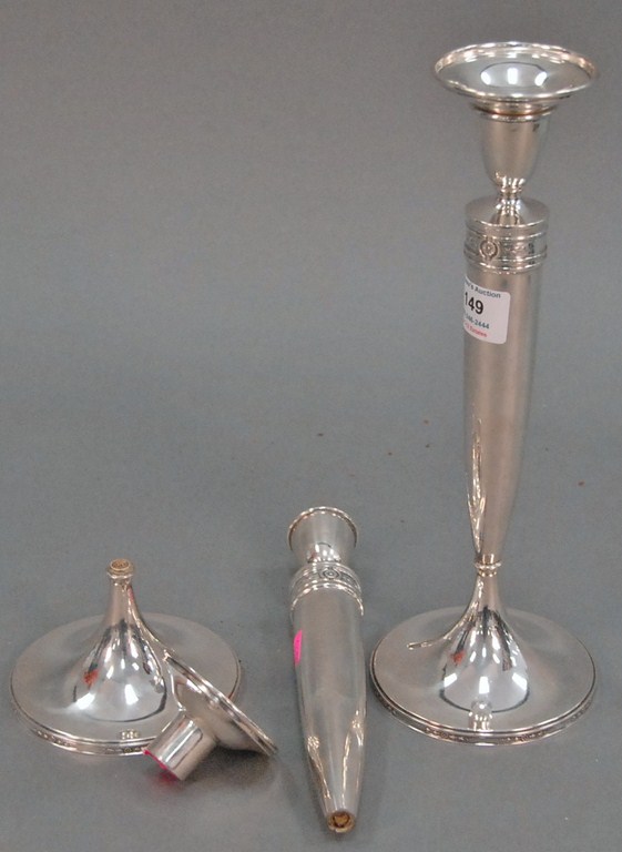 Lot 149: Pair of weighted sterling silver candle sticks one as is and two framed black and white prints.