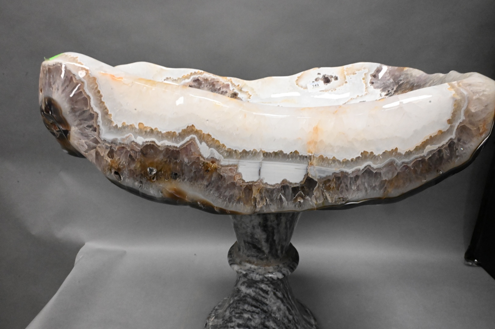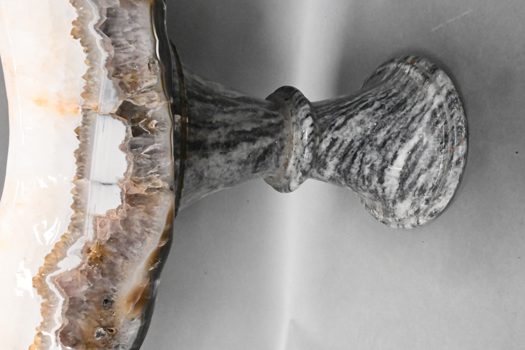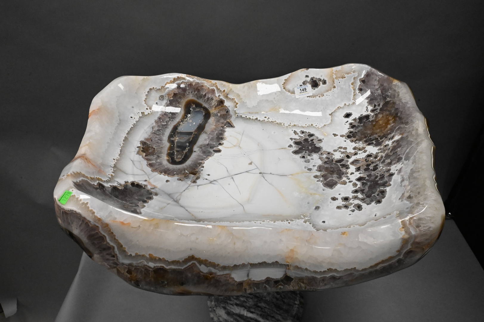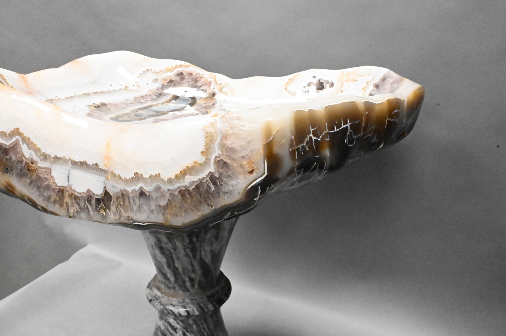 Polished Stone Birdbath, on marble pedestal, total height 23 inches, top 20″ x 26″. Provenance: Estate of Peter Tillou, Litchfield, Connecticut.