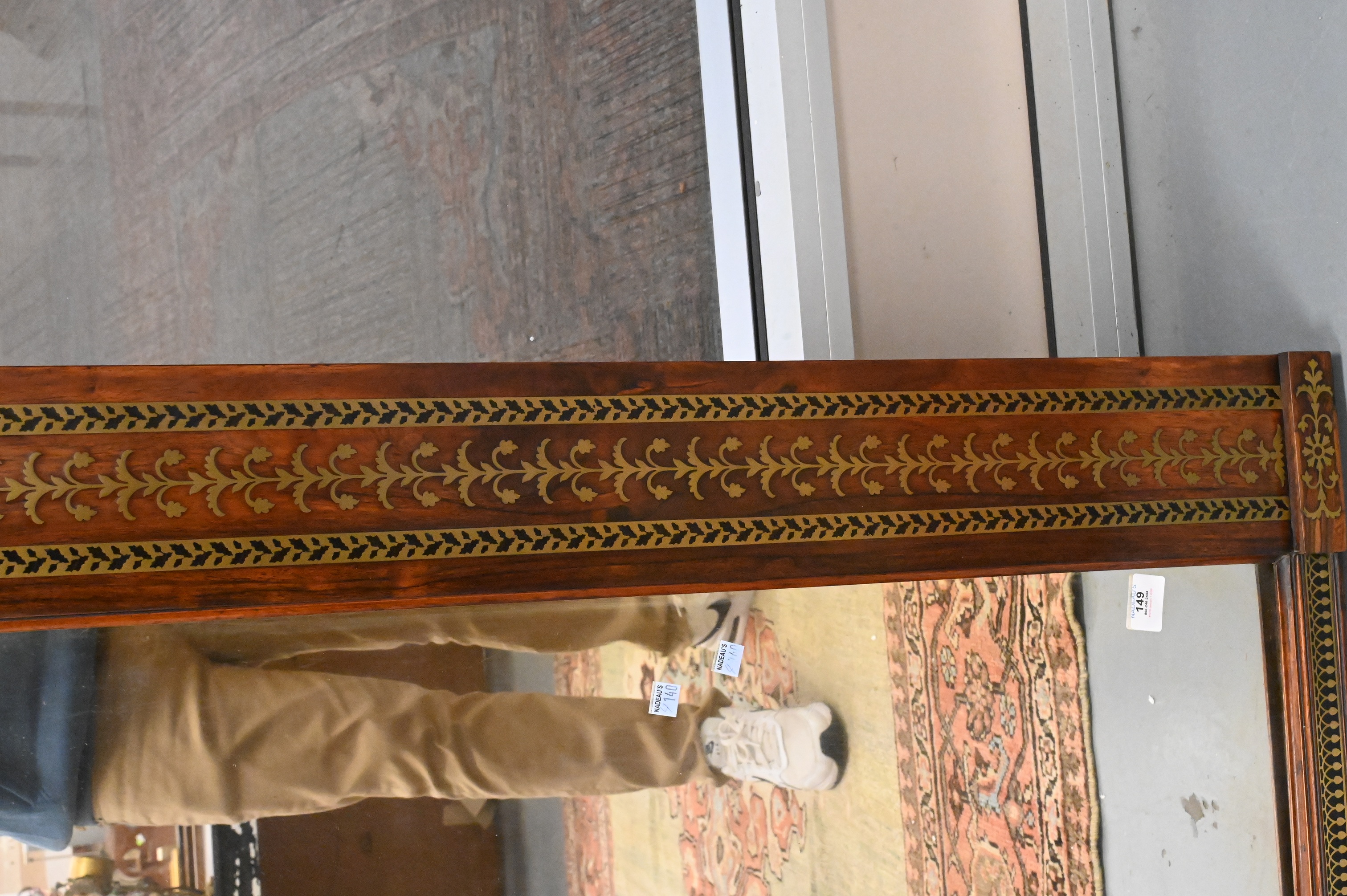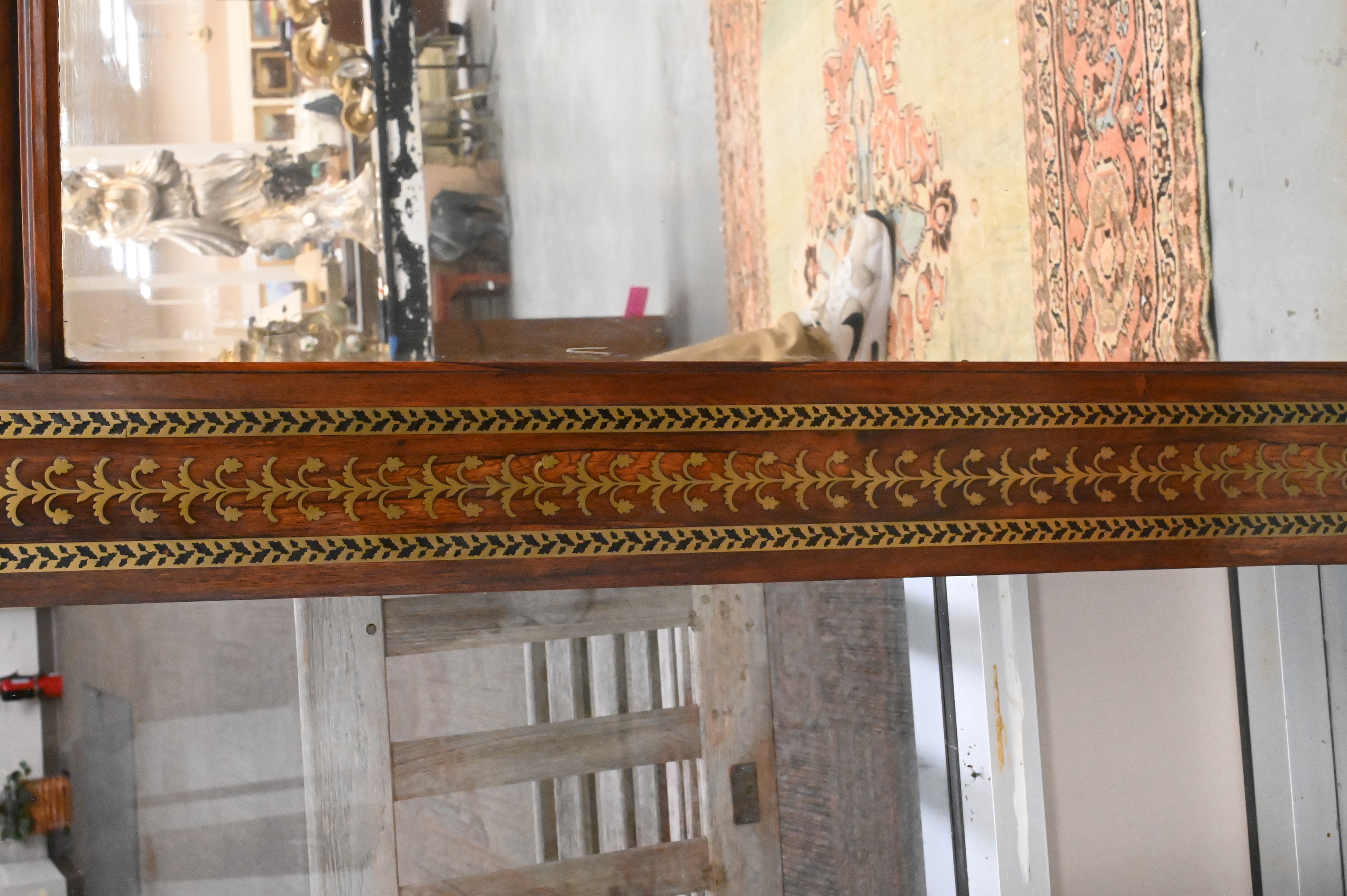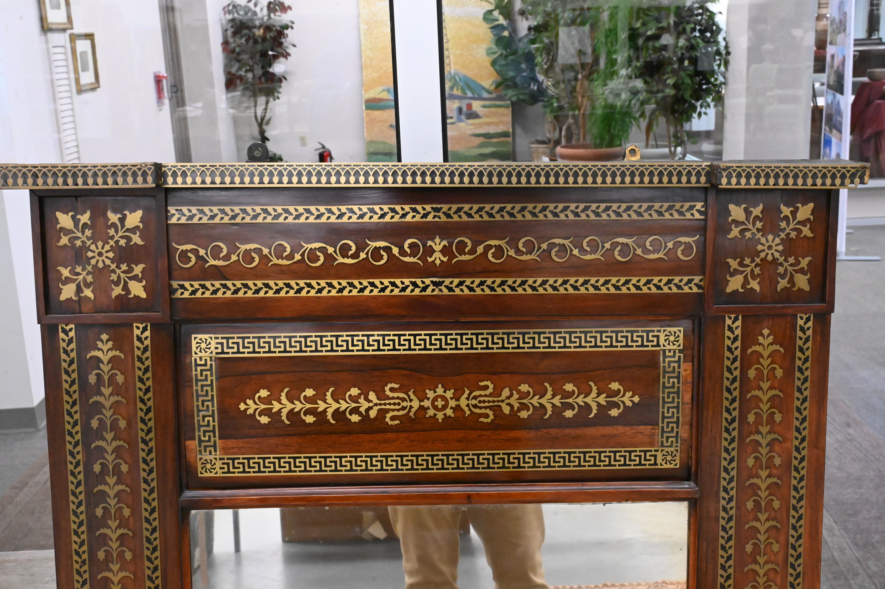 rectangular mirror richly veneered in rosewood and inlaid throughout with intricate brass marquetry in Greek key, foliate, and scroll motifs, the crest with additional brass panels and molded cornice