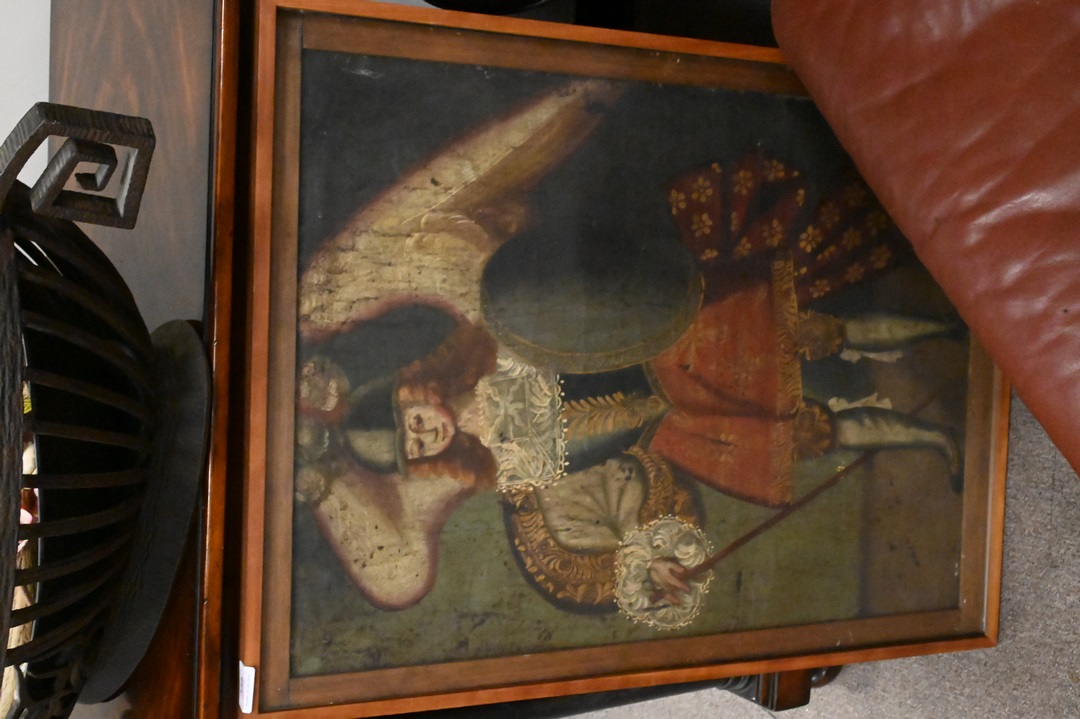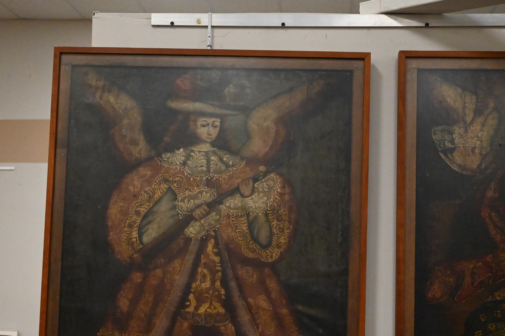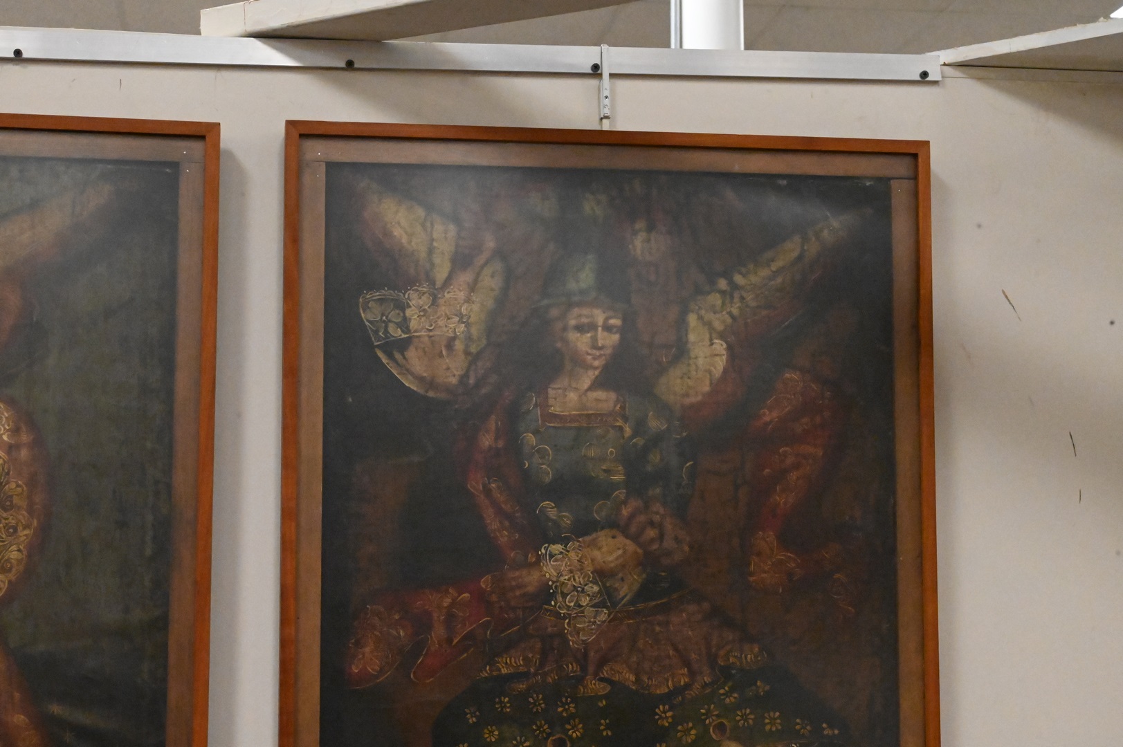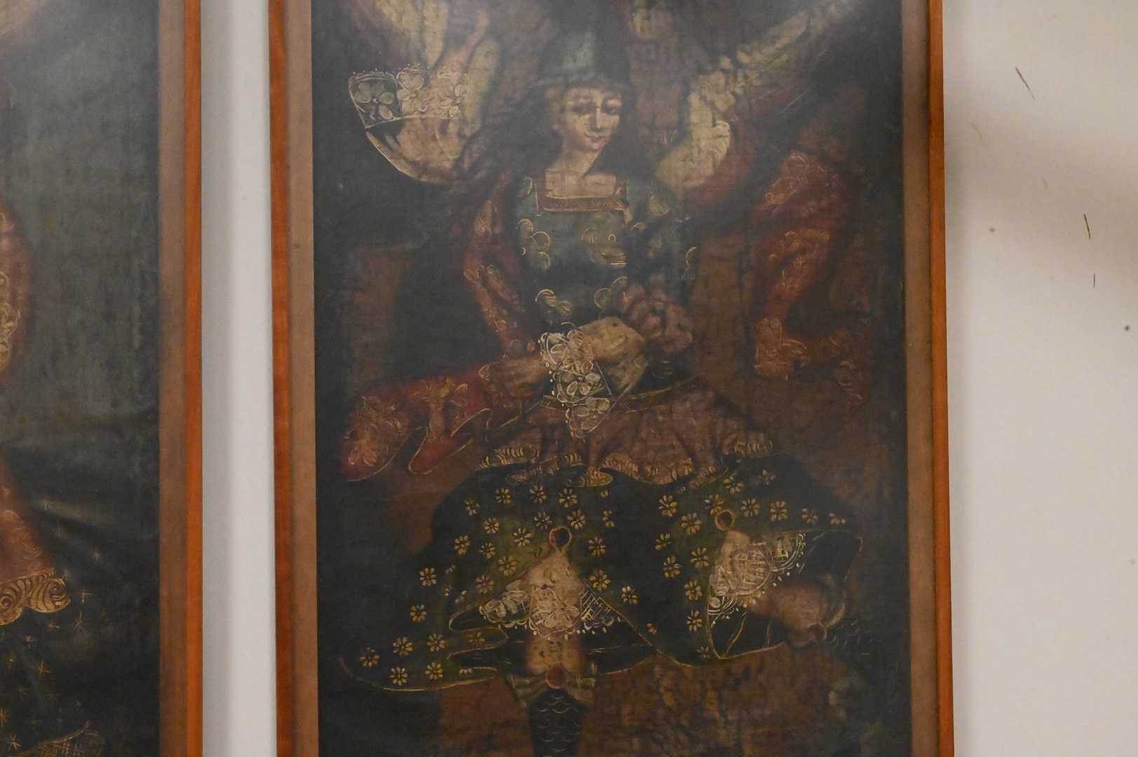 Set of Three Cuzco School Spanish Colonial Paintings, 18th/19th century, depicting archangel with Arquebus, San Miguel and Michael.