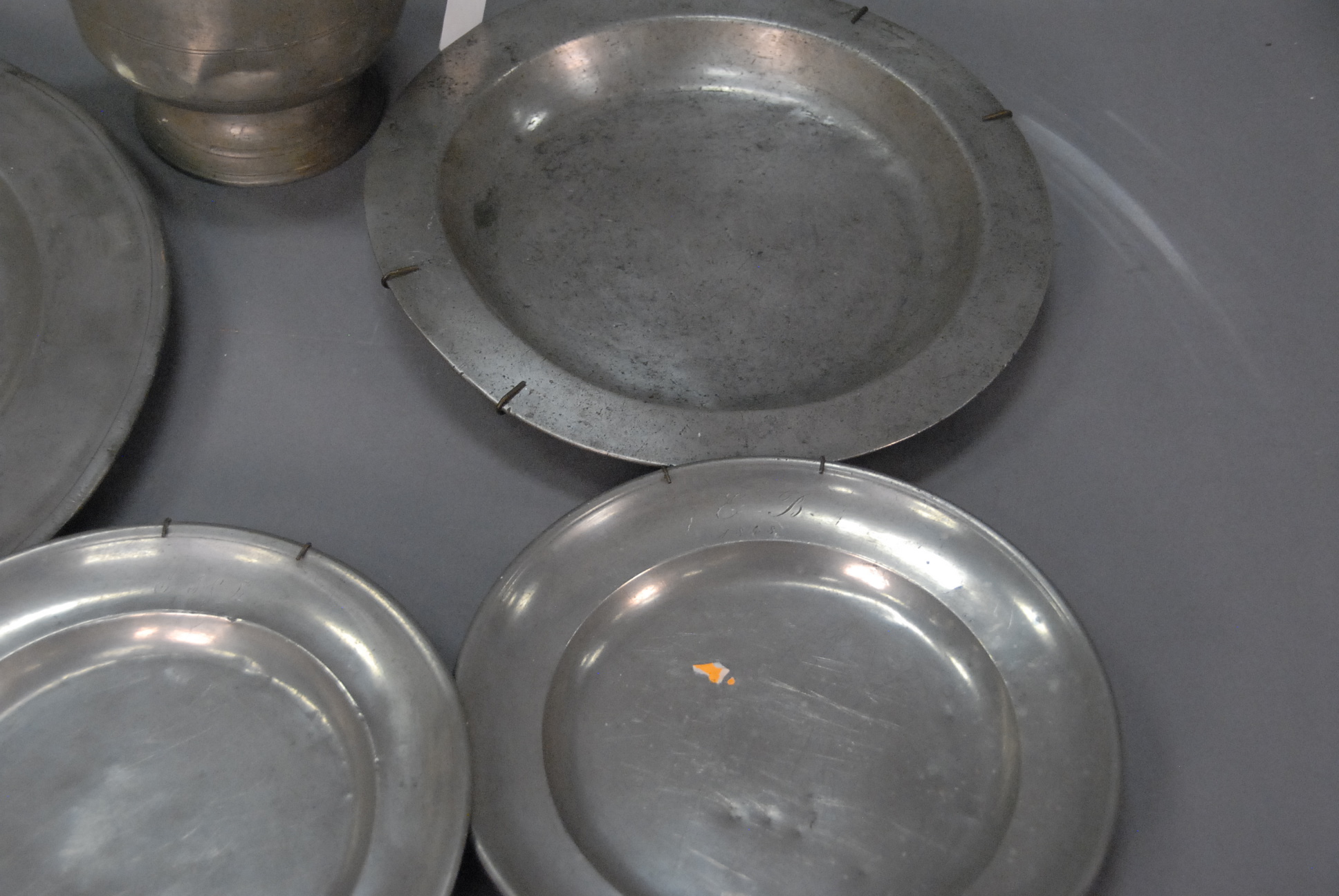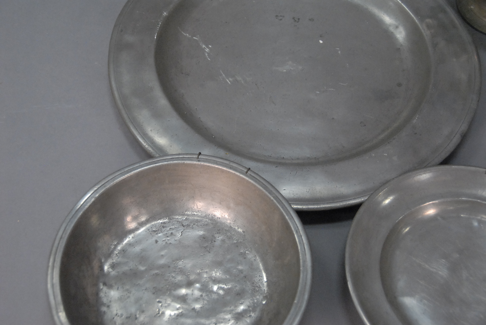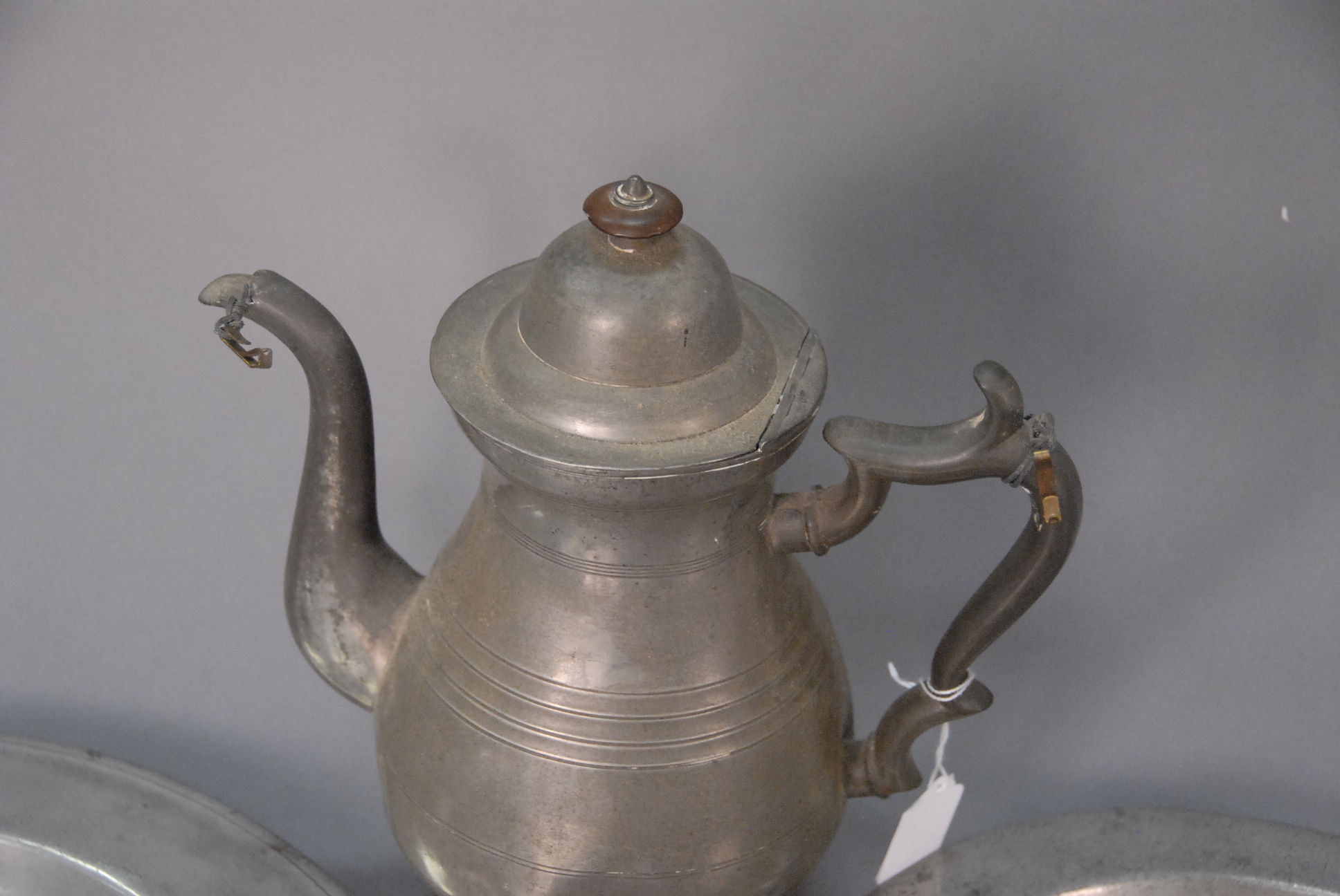Six piece lot of early pewter with coffee pot Middletown, CT, English bowl and plates.