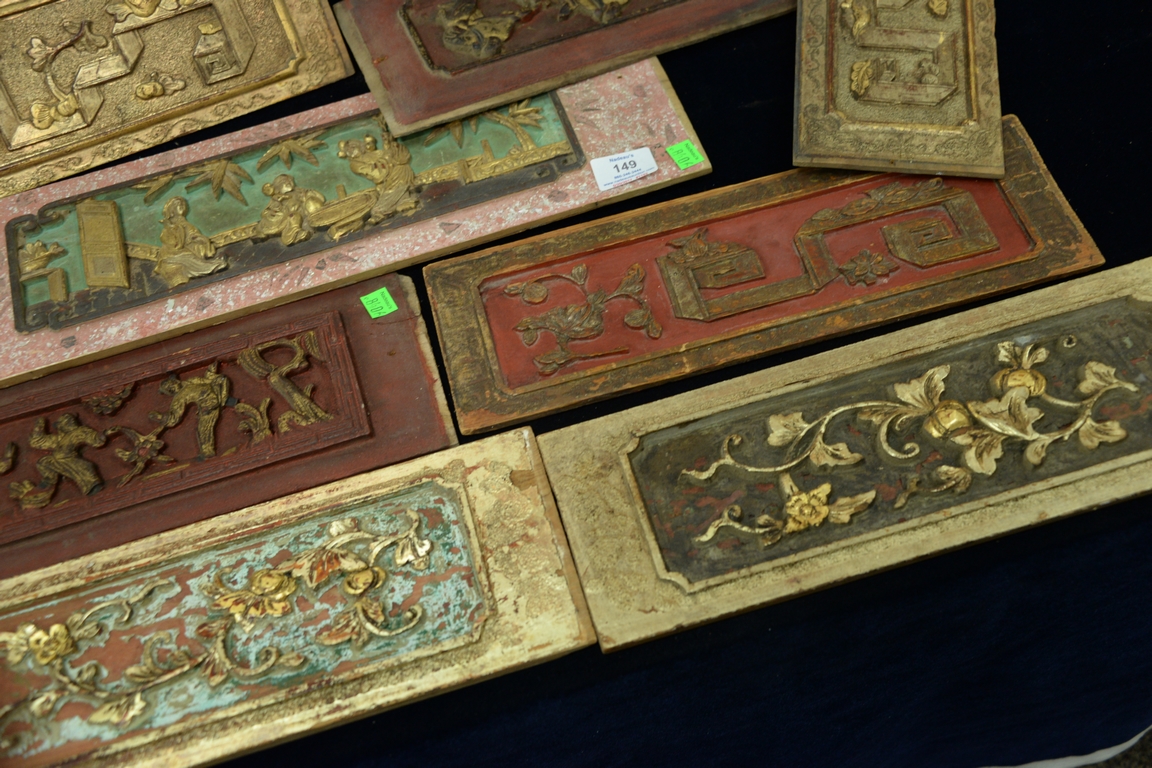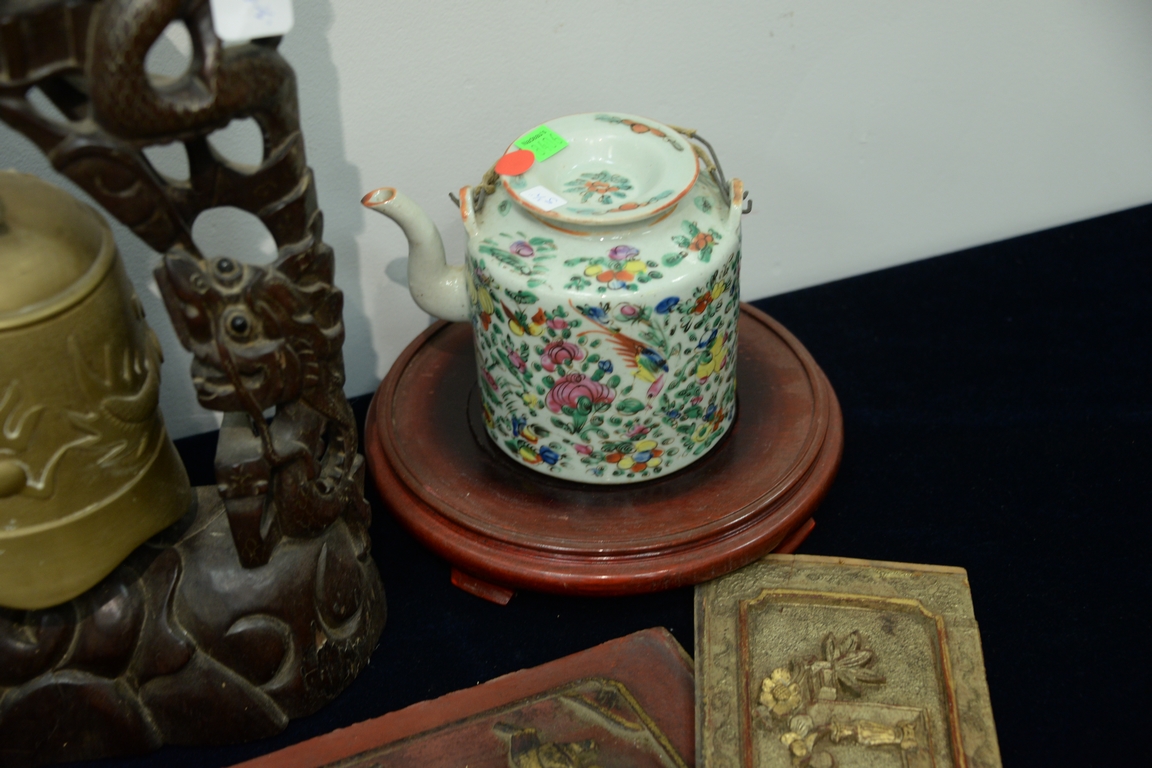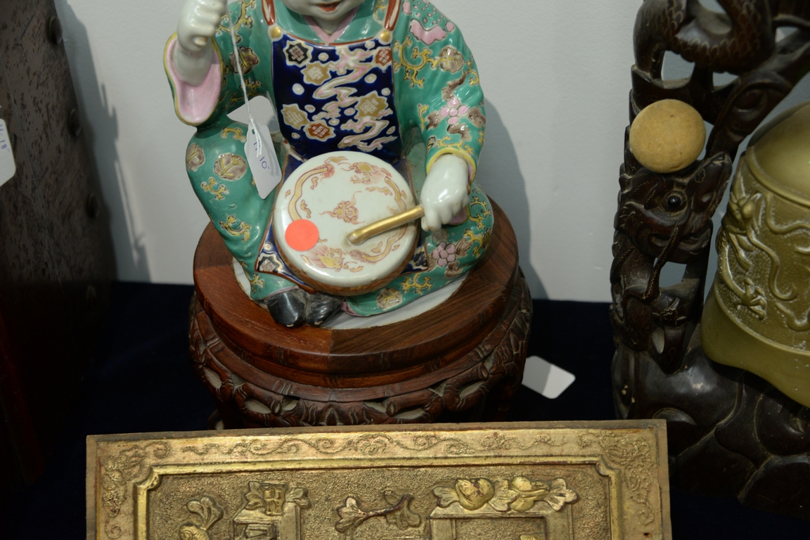 Thirteen piece lot to include an antique Chinese temple brass bell with dragons, carved Chinese stand with marble insert, porcelain figure of a boy playing a drum, eight carved wood panels, famille rose teapot, and hardwood stand. bell ht. 18in. Provenance: Collection of Anne Jones Willis and the late John Ralph Willis, New Jersey