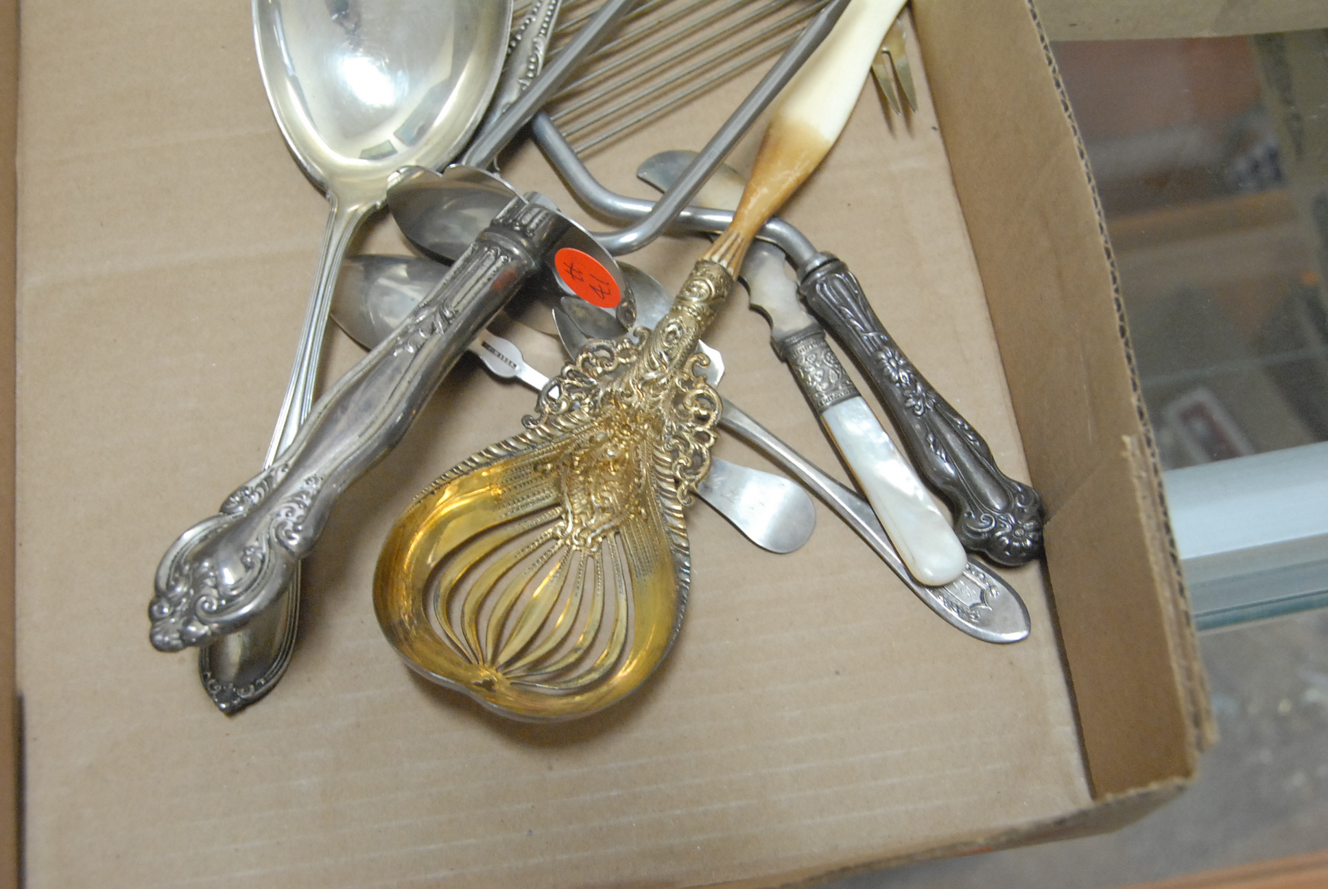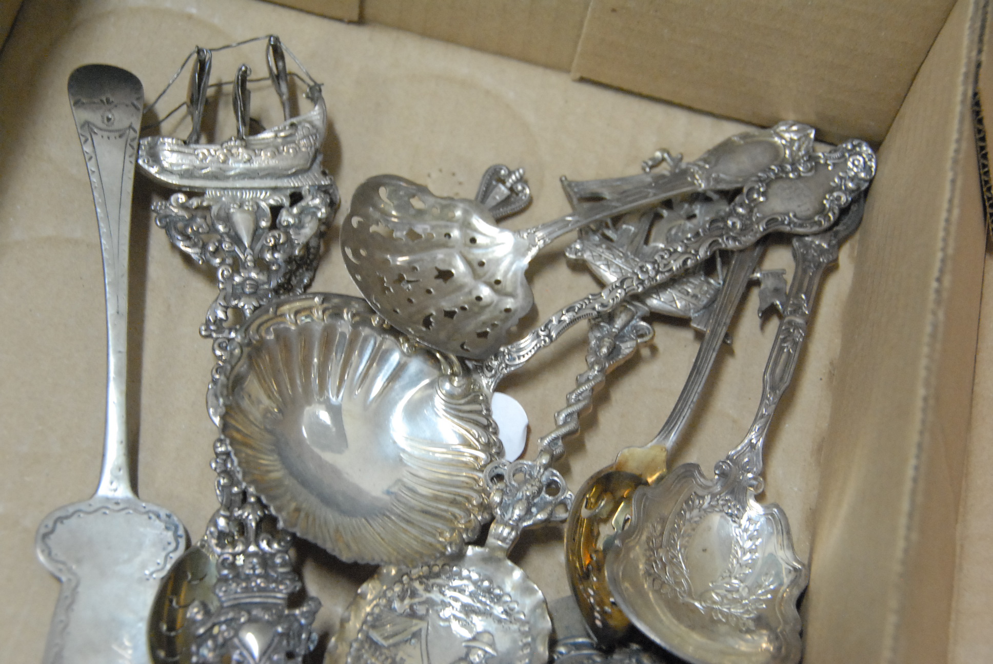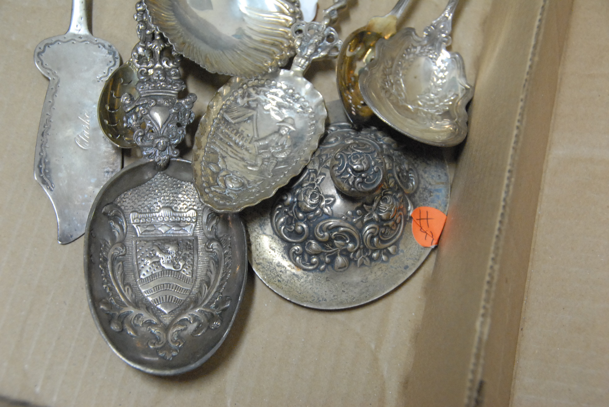 Two box lots of sterling and continental silver, various elaborate serving spoons, and miscellaneous spoons. 14.5 troy oz.