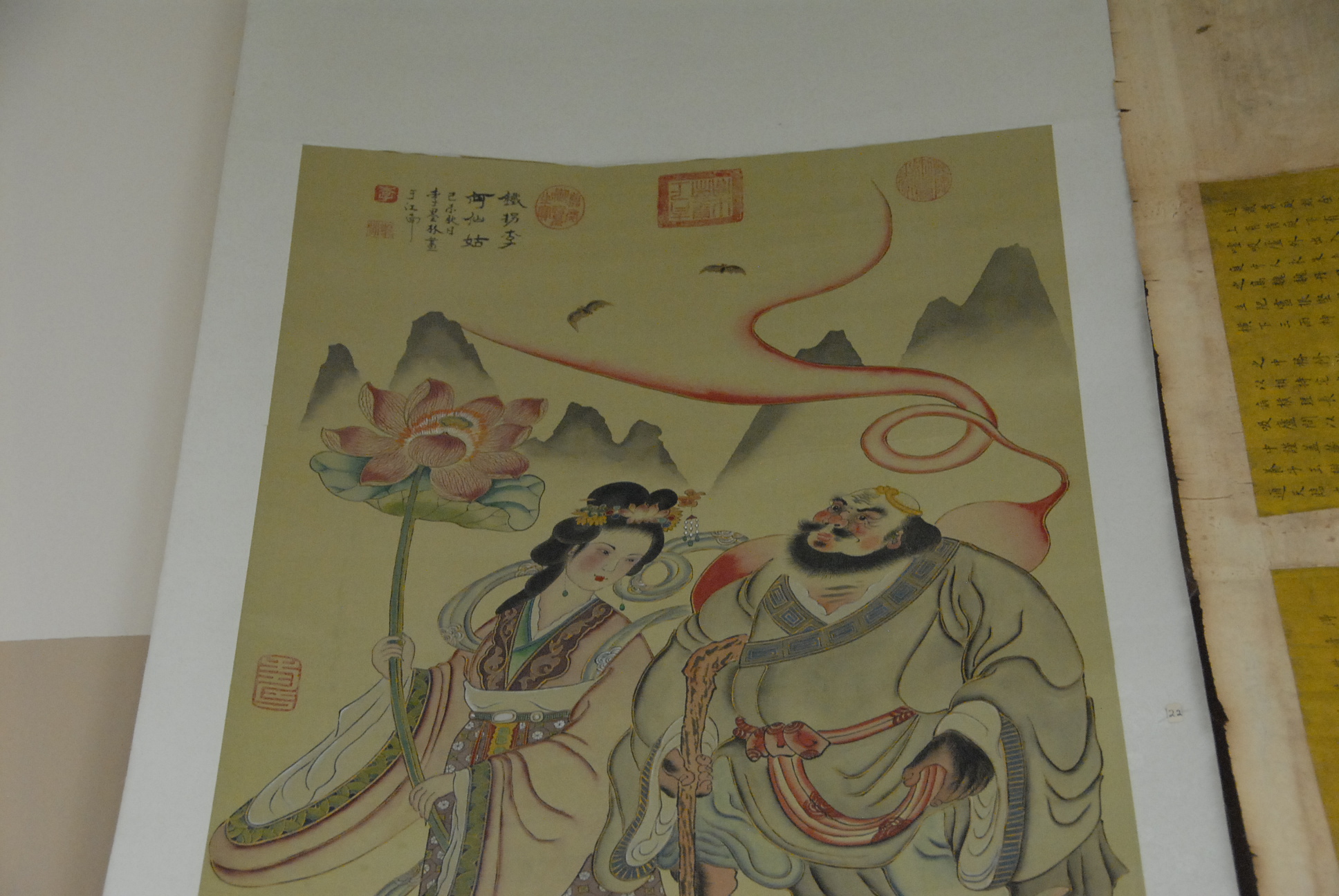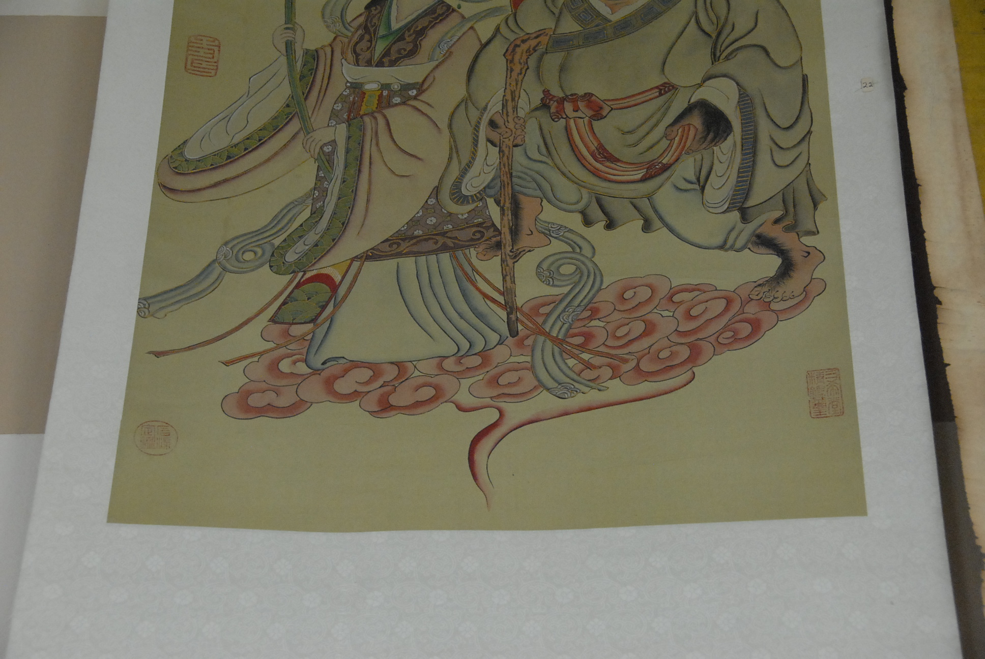 Lot 149: Two Oriental scrolls one with scholar figures in landscape 35 x 21 and the other with Guanyin figure and warrior figure 36 x 20.