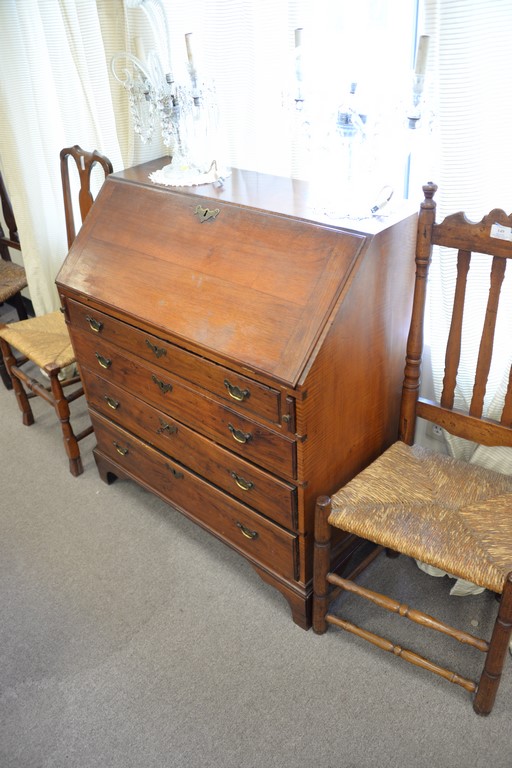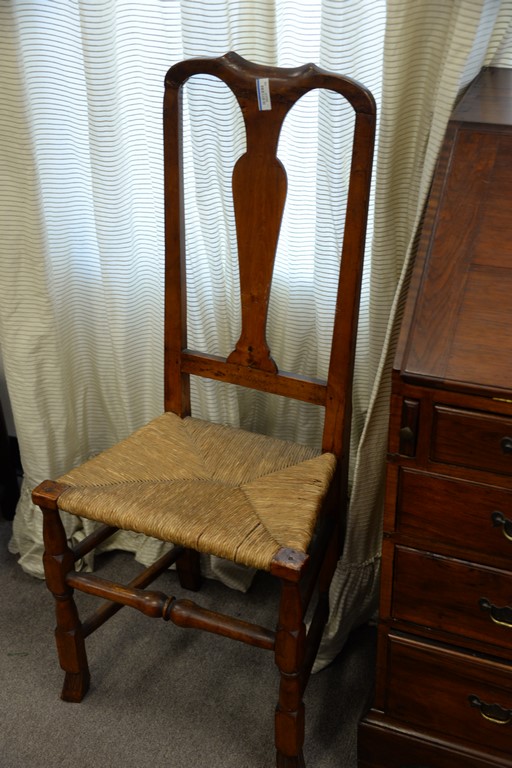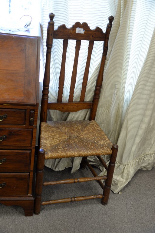 Lot 149: Two primitive rush seat side chairs, one with splat back and French feet and the other banister back. seat ht. 17in., total hts. 40i…