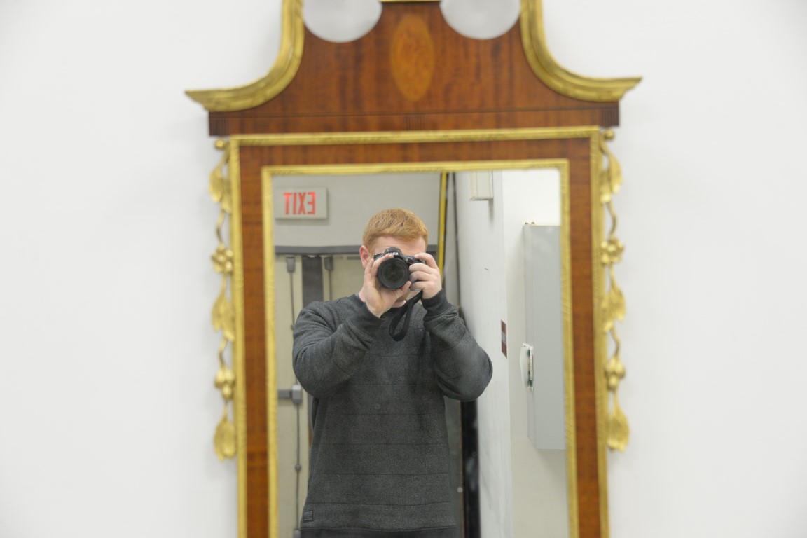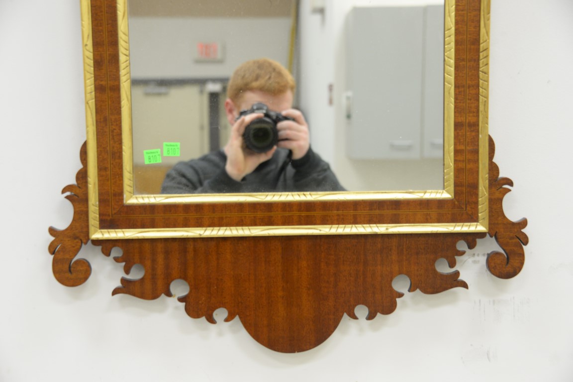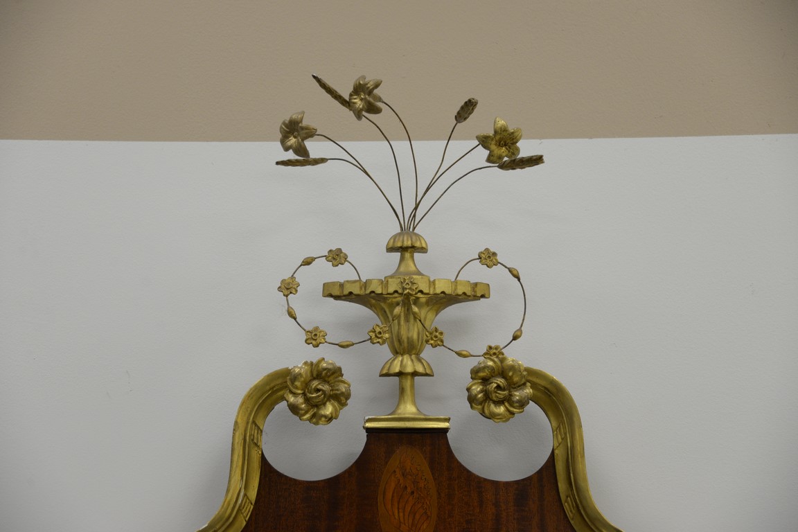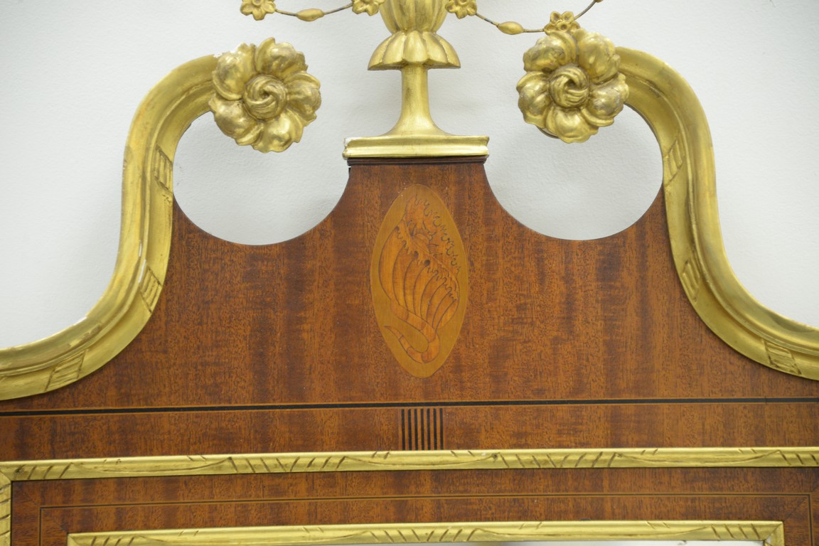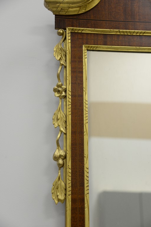 Lot 149A: Margolis mahogany Federal style inlaid mirror with gilt urn and pediment top, signed Margolis on reverse. 24 x 57