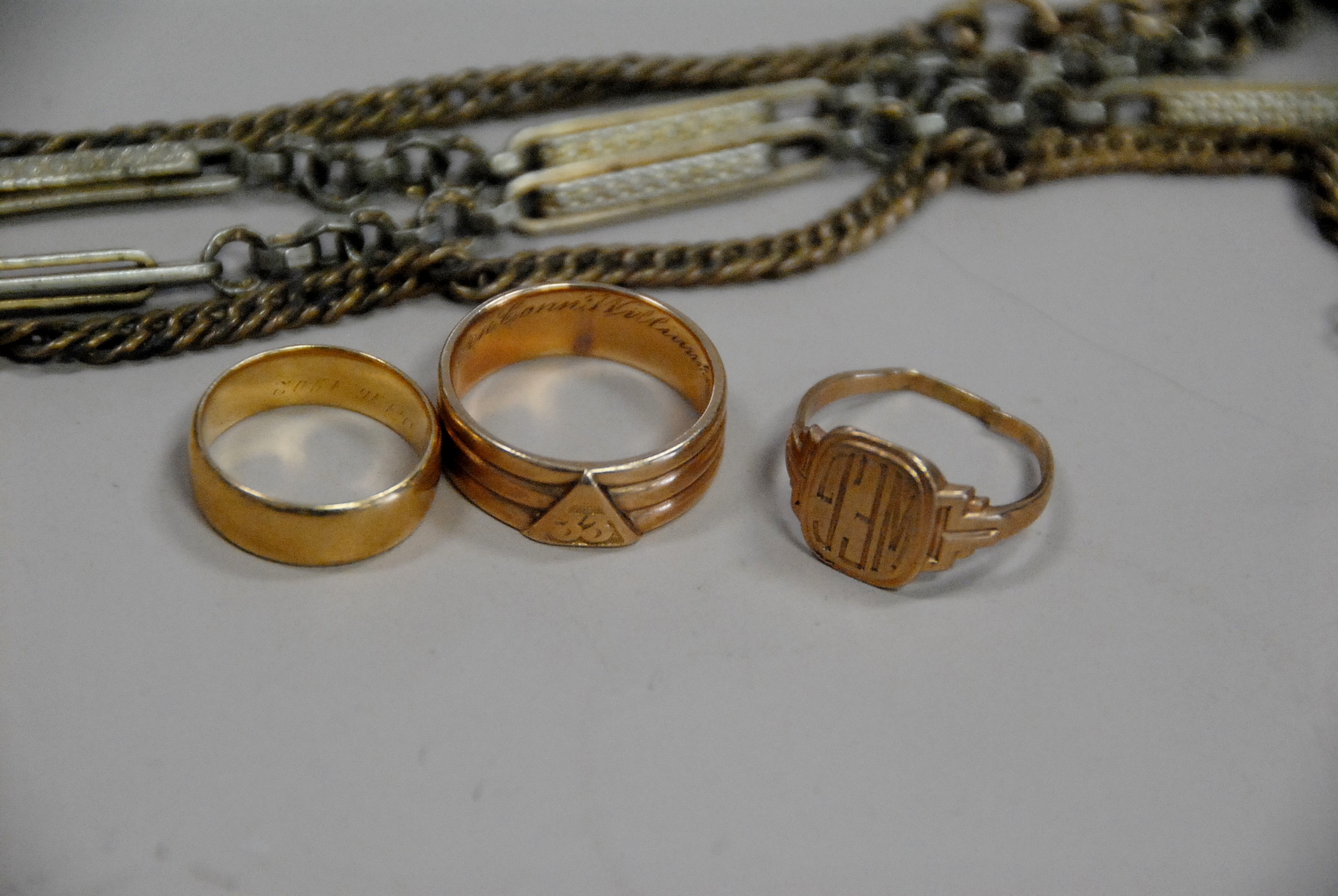 Group of three gold rings, 18K & 10K and a watch chain, 16.3 grams.