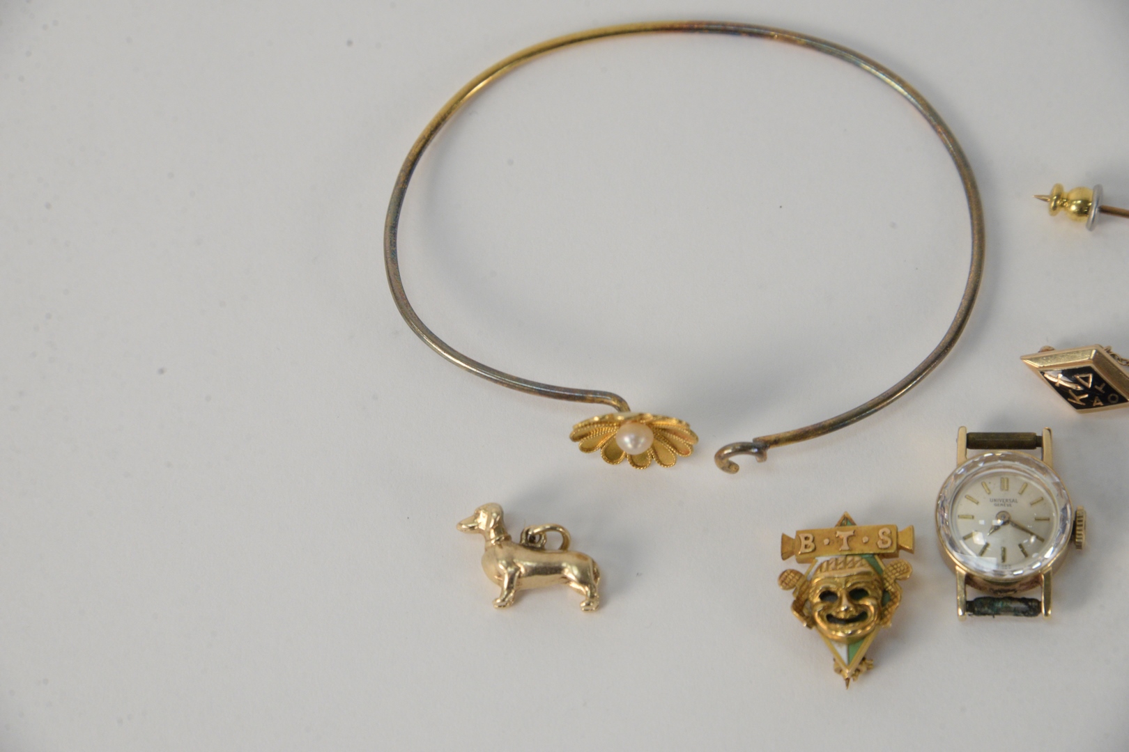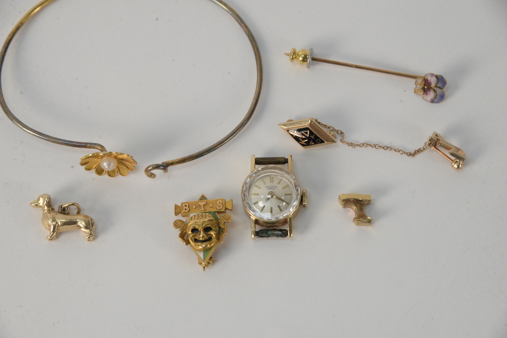 Lot 15: 14 Karat Gold Lot, with ladies wristwatch, bracelet, two pins, etc., 22.9 grams total weight.