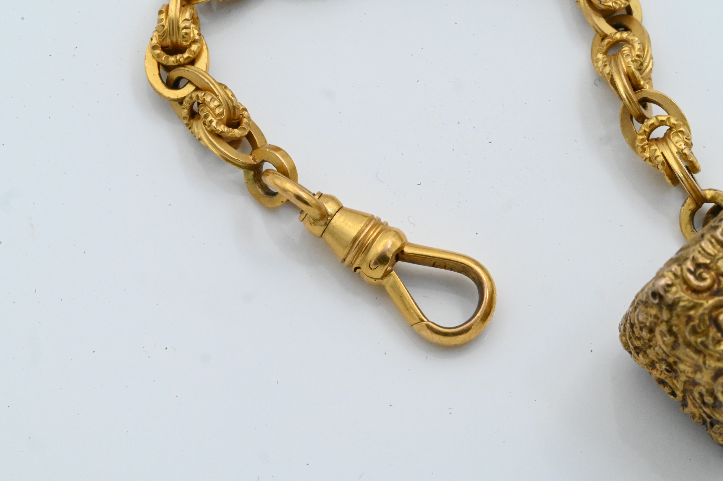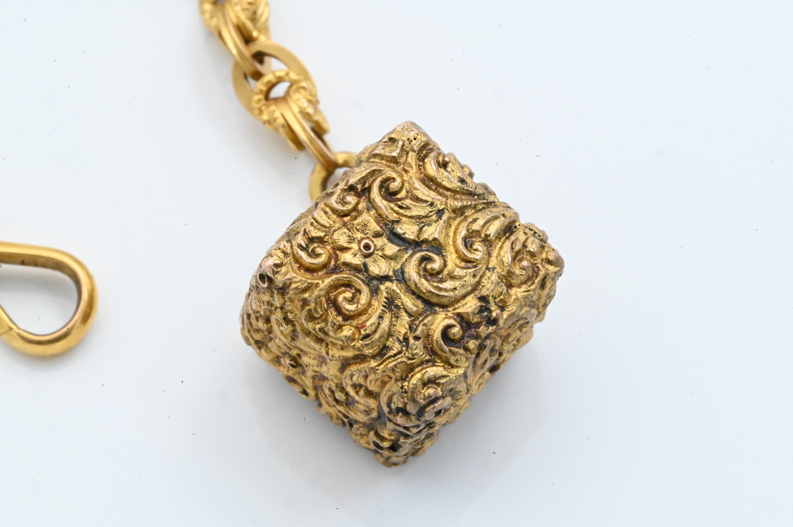 Lot 15: 14K Yellow Gold Ornate Fob Chain with Textured Cube Pendant
