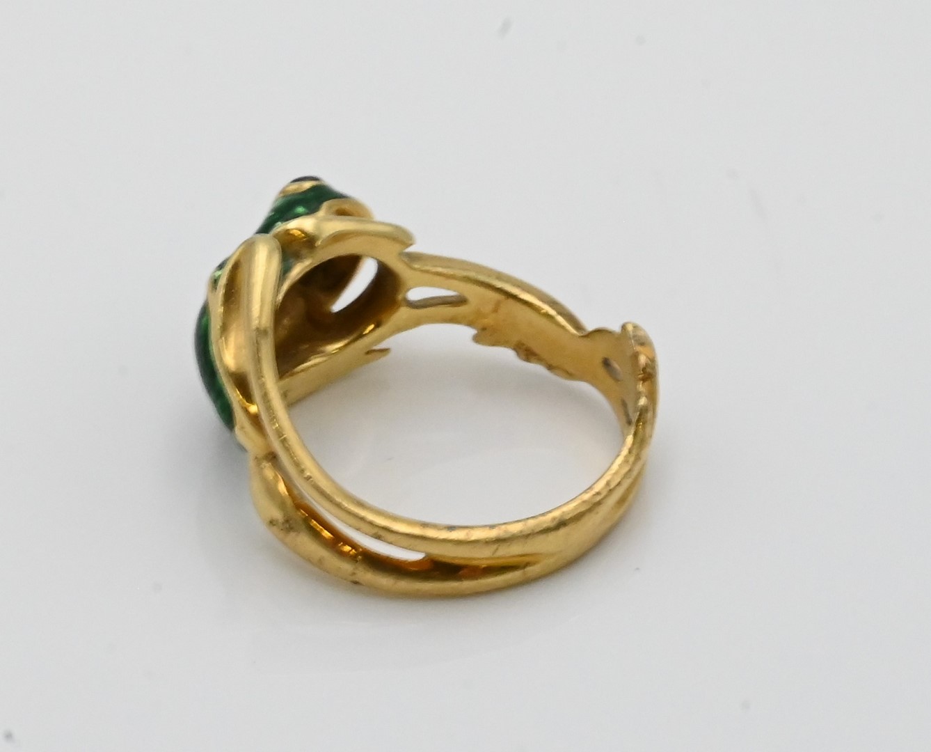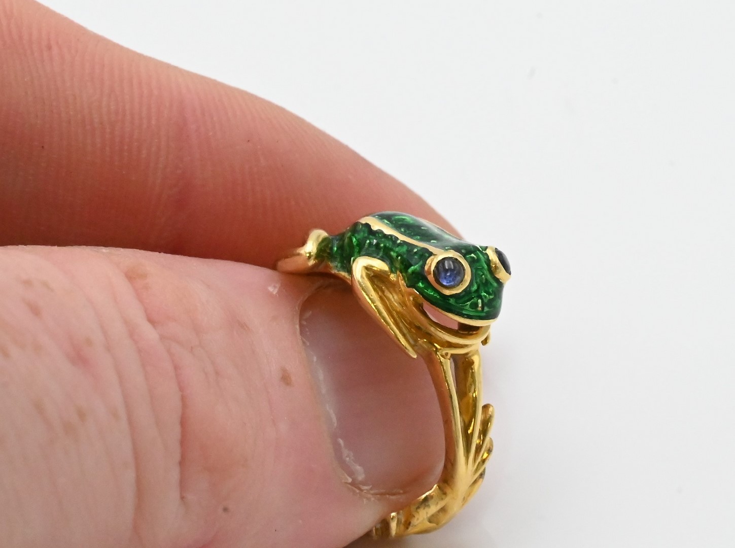 18 Karat Gold Ring, having enameled frog, makers mark “f”, size 6, 6.5 grams.