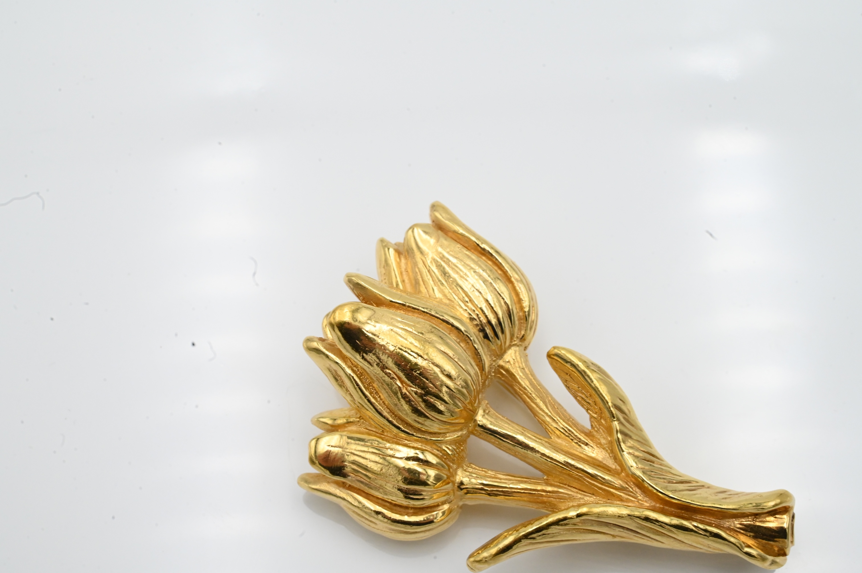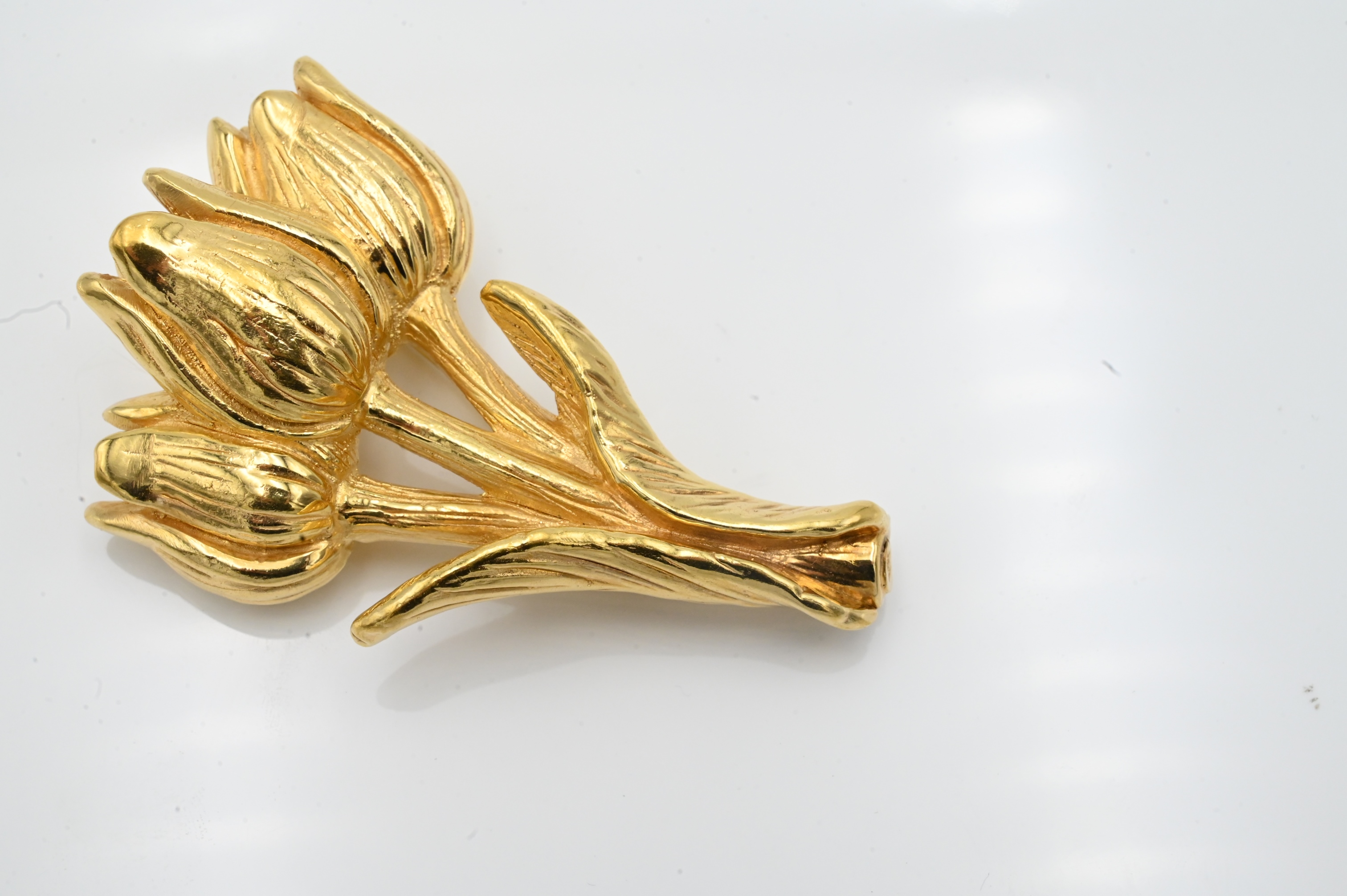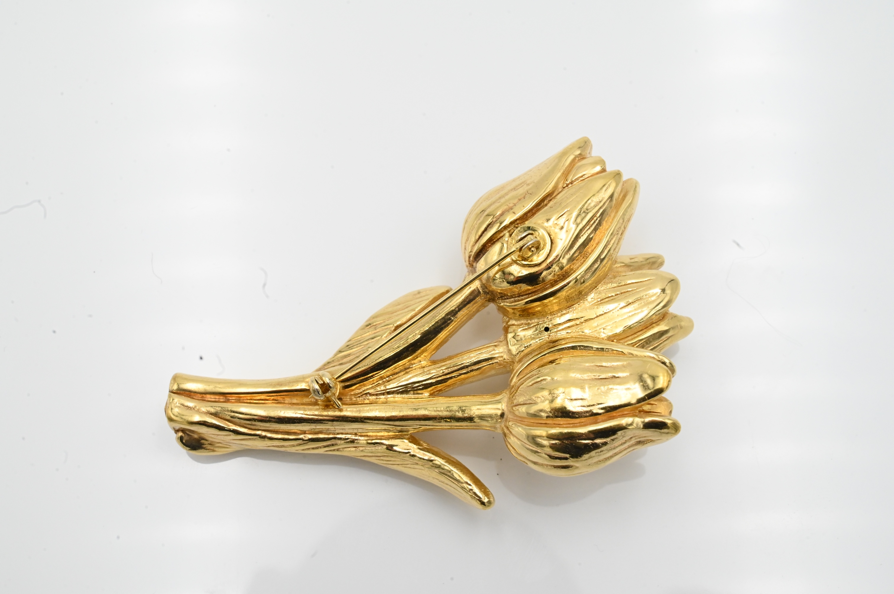 18 Karat Yellow Gold Brooch, in the form of triple flowers, hollow, length 3 inches, 15.2 grams.
