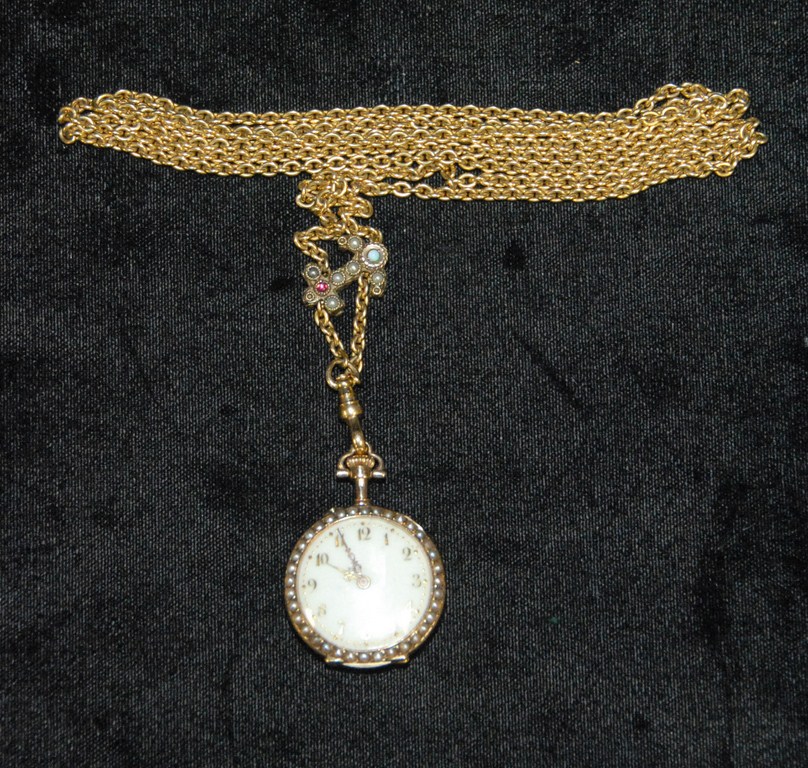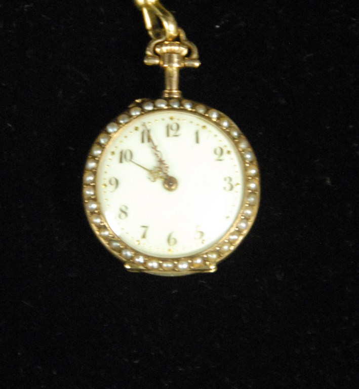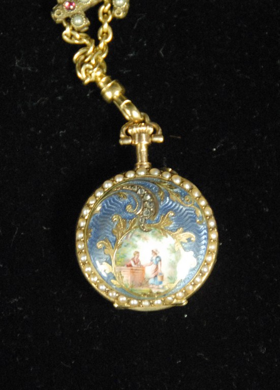 Lot 15: 18K gold lady’s lapel watch on 18K gold slide watch chain with enameled back, pearls surround on back and front, Swiss made. 41.9 gr…