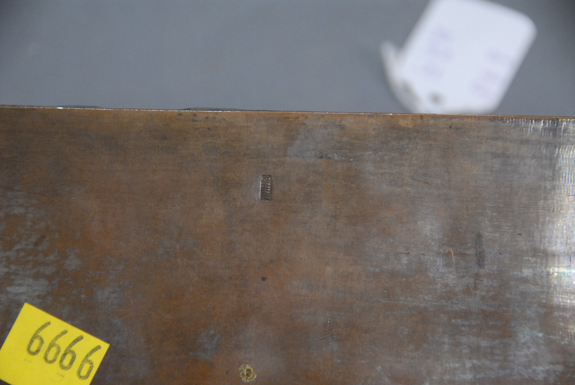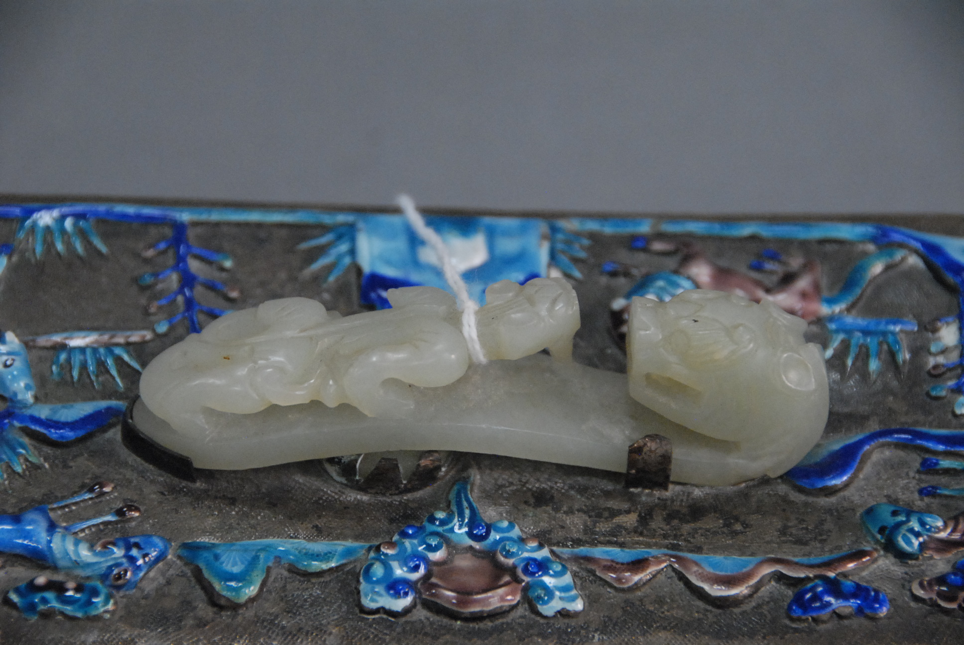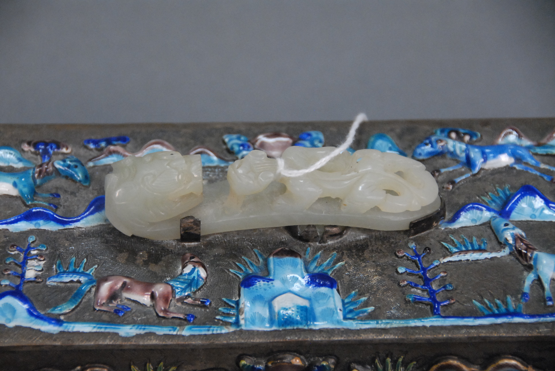 Celadon jade dragon belt buckle lg. 3 3/4in. mounted on an enameled cigarette box with enameled horses lg. 12in. ht. 2 1/2in. wd. 3 1/2in.